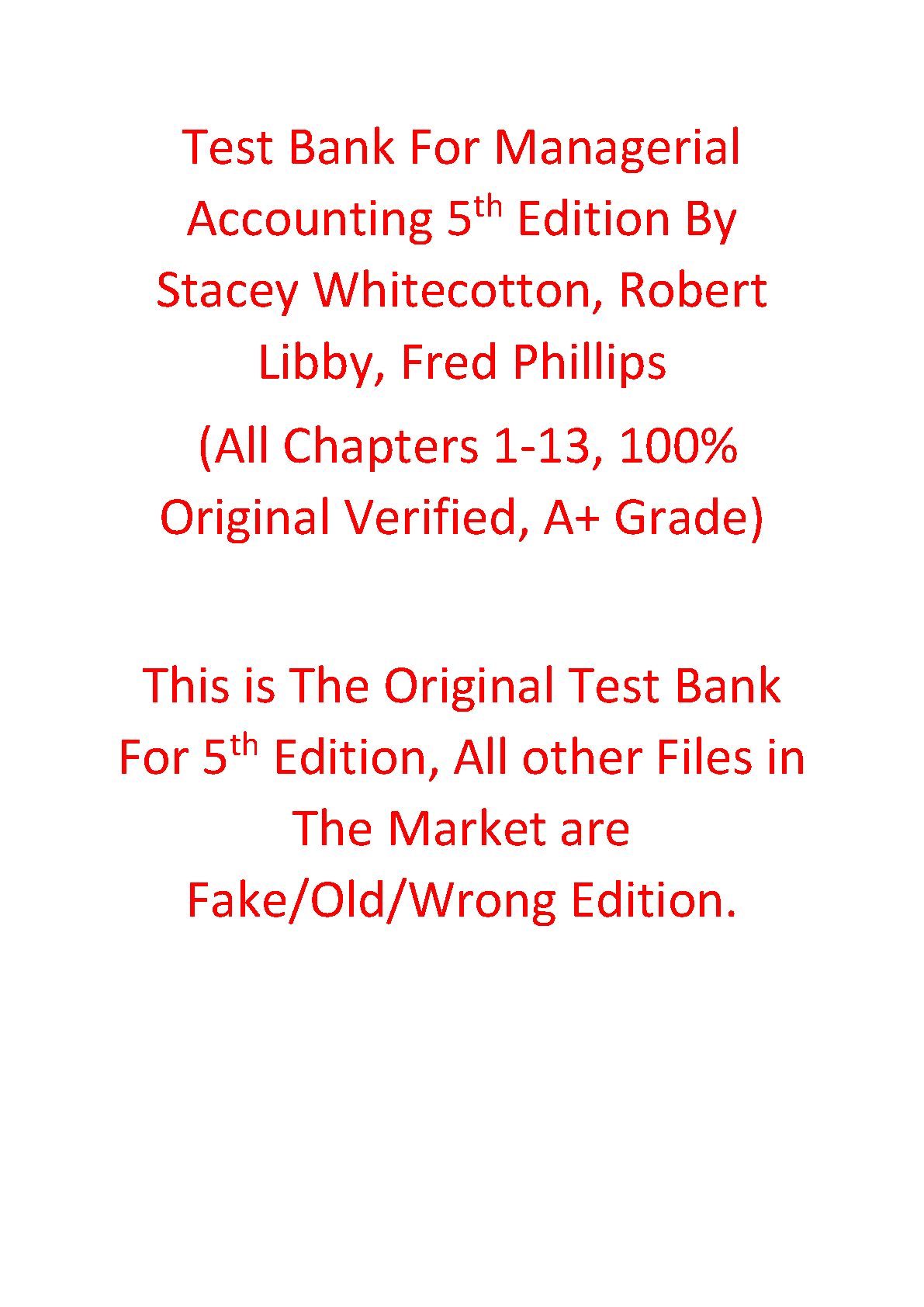 Achieve top grades in your course with the official Test Bank for Managerial Accounting, 5th Edition by Whitecotton, Libby, and Phillips. This is the complete, verified resource covering all chapters (1-13), packed with authentic exam-style questions and detailed answers. Prepare effectively to master key concepts, ace your exams on the first try, and secure an A+ grade. This is the ultimate study companion to help you succeed in your accounting studies.