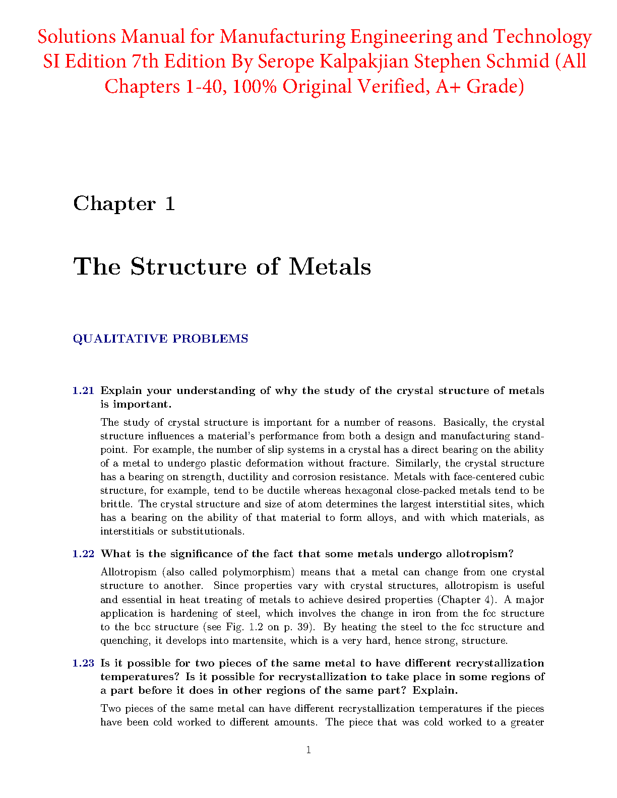 Official Solutions Manual for Manufacturing Engineering and Technology, SI 7th Edition by Serope Kalpakjian and Stephen Schmid