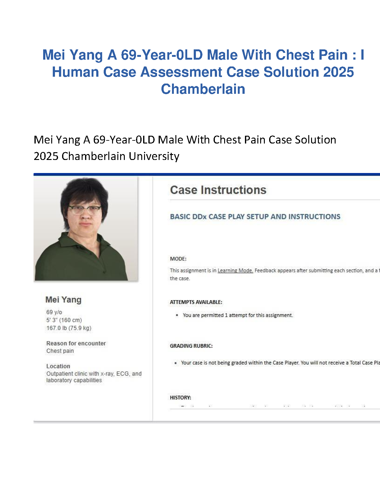 Unlock exam success with the latest 2025/2026 i-Human case solution for Mei Yang, a 69-year-old male presenting with chest pain. This comprehensive guide, tailored for Chamberlain University students, provides a step-by-step walkthrough of the entire case assessment. Master differential diagnoses, patient interviews, and treatment plans to ace your assignment on the first try. This is the ultimate study aid to help you pass your exams and avoid resits.