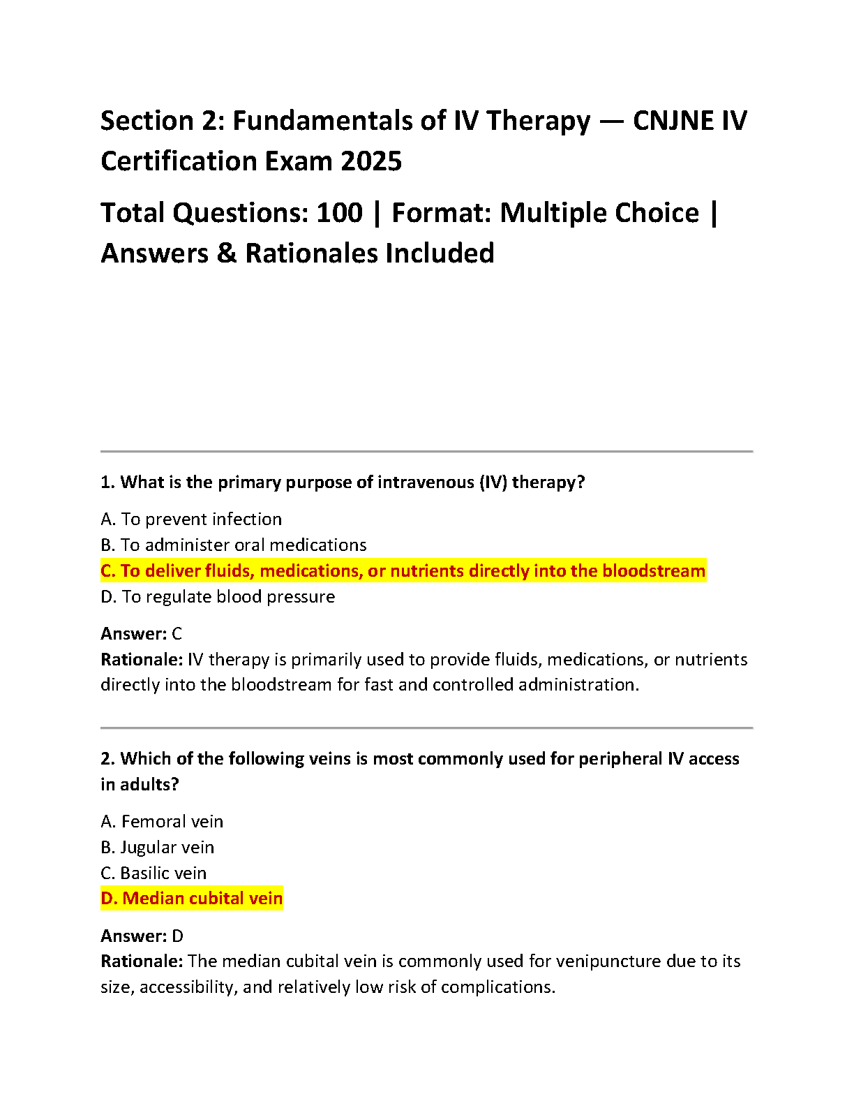Ace your CNJNE IV Therapy Certification Exam in 2025 with our expertly crafted test bank. This comprehensive study resource features 100 multiple-choice questions, each complete with a verified answer and in-depth rationale. Master the fundamentals of IV therapy, from primary purposes to procedural best practices. Designed to help you pass on your first attempt, this guide is your key to certification success. Download now and start preparing with confidence!