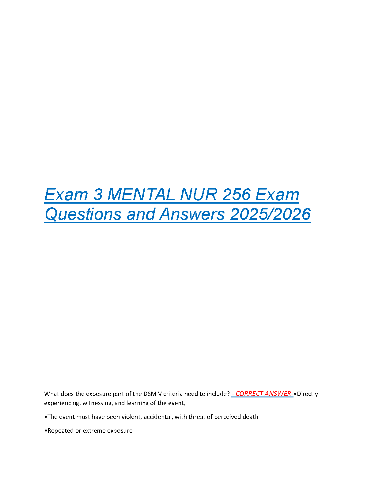 Get ready to excel in your Mental Health Nursing course with our comprehensive test bank for MENTAL NUR 256, Exam 3. This latest 2025/2026 edition features a complete collection of exam questions with verified, correct answers. Designed to align with key concepts from the leading textbook, 'Varcarolis' Foundations of Psychiatric-Mental Health Nursing, 9th Edition' by Margaret Jordan Halter, this study guide is your ultimate tool for success. Master complex topics like DSM-5 criteria, practice with real exam-style questions, and boost your confidence to pass on your first attempt. Instantly downloadable and perfect for targeted revision to avoid resits.