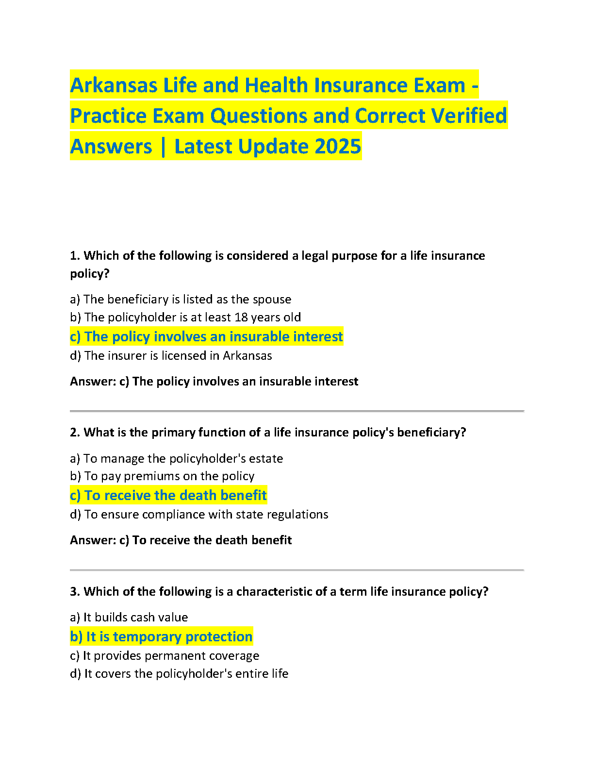 Ace your Arkansas Life and Health Insurance licensing exam on the first try with our comprehensive 2025 Test Bank. This essential study guide features a complete collection of practice questions, each paired with a correct, verified answer. Master key concepts such as insurable interest, policy functions, and types of insurance. Designed for the 2025/2026 academic year, this resource is your ultimate tool for success, helping you avoid resits and confidently earn your license.