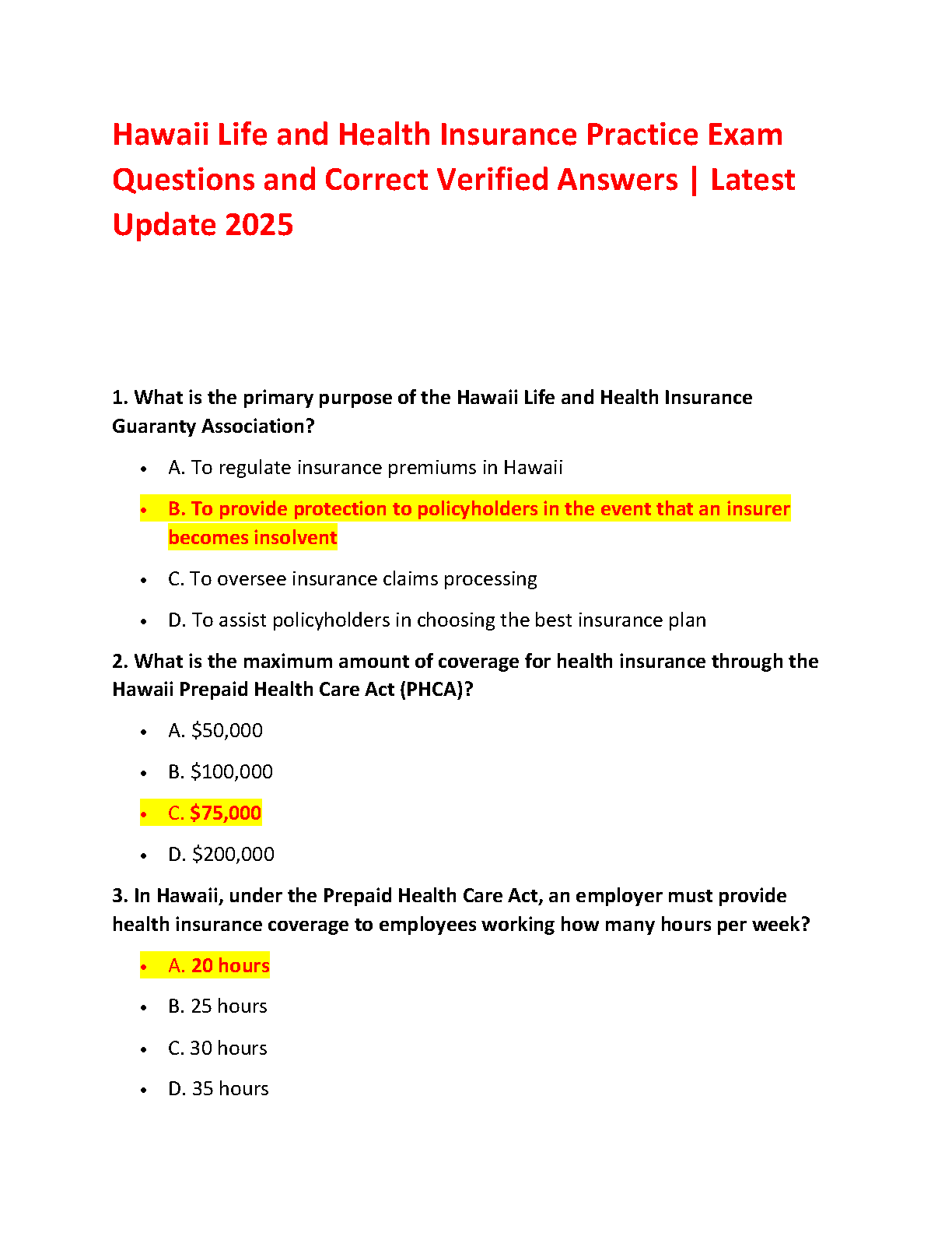 Ace your Hawaii Life and Health Insurance license exam on the first try! This comprehensive test bank is your ultimate study guide for the 2025/2026 academic year. It features a wide range of practice questions covering all critical topics, including the Hawaii Life and Health Insurance Guaranty Association and the Prepaid Health Care Act (PHCA). Each question comes with a correct, verified answer, ensuring you understand the material thoroughly and are fully prepared for the real exam. Stop worrying about resits and gain the confidence you need to succeed. This latest edition is designed to mirror the actual test format, making it the most effective tool for your exam preparation.