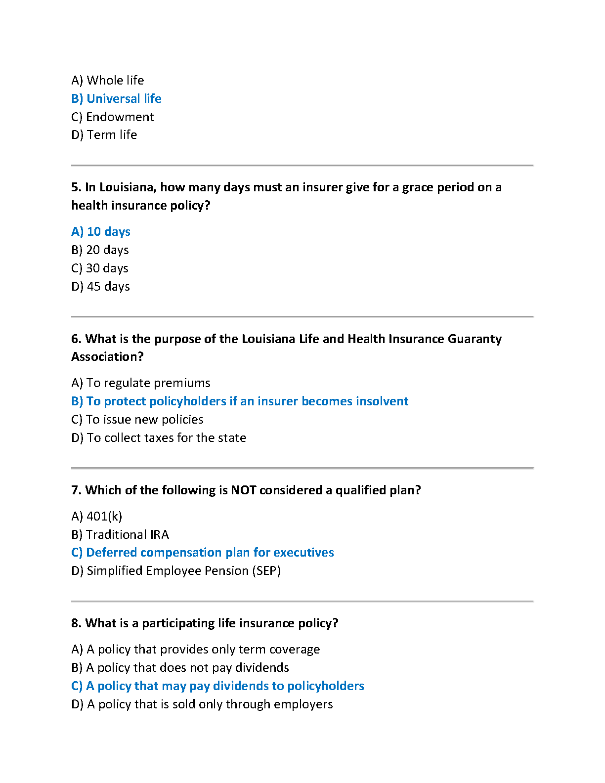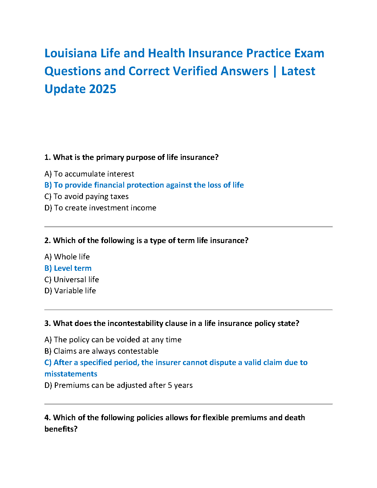 Louisiana Life and Health Insurance License Exam Test Bank 2025/2026: Comprehensive Questions with 100% Verified Answers