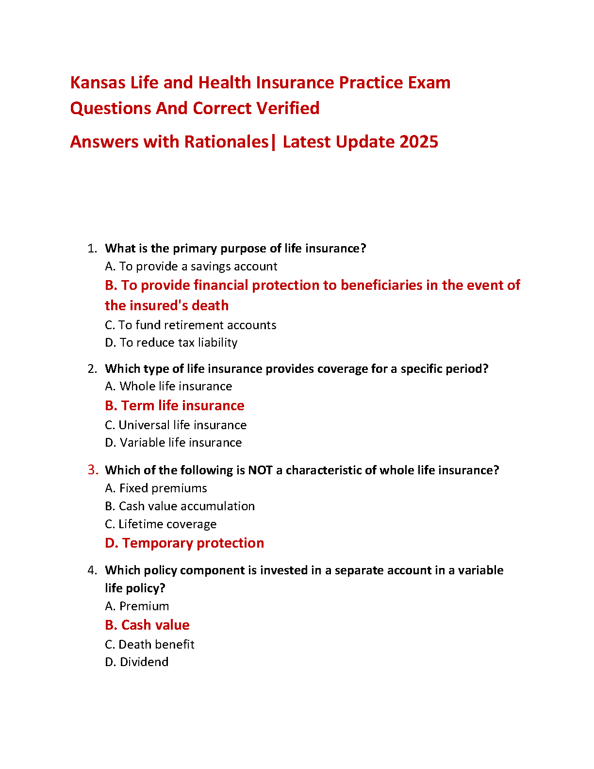 Ace your Kansas Life and Health Insurance licensing exam on the very first try with our ultimate 2025-2026 study guide! This comprehensive test bank is packed with the latest practice questions, all featuring correct, verified answers and detailed rationales. Understand the core concepts, from the primary purpose of life insurance and the specifics of term vs. whole life policies, to key components like cash value. This resource is expertly designed to cover all essential topics, ensuring you walk into the exam room with confidence and walk out with your license. Avoid costly resits and fast-track your insurance career today!