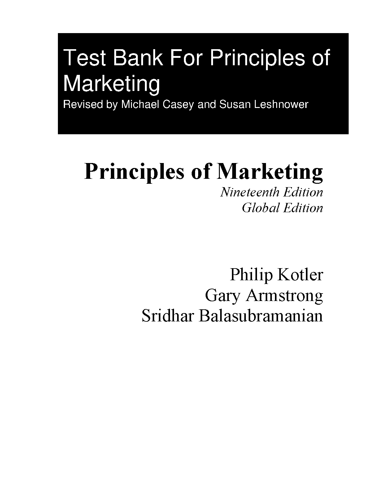 Test Bank for Principles of Marketing, 19th Edition by Philip Kotler, Gary Armstrong & Sridhar Balasubramanian