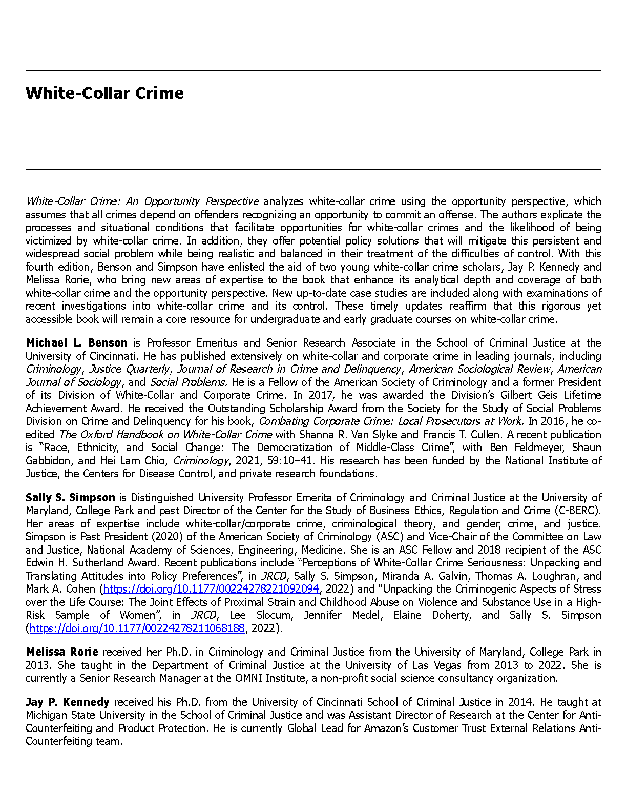 Test Bank for White-Collar Crime: An Opportunity Perspective, 4th Edition by Michael L. Benson, Sally S. Simpson, Melissa Rorie, and Jay P. Kennedy