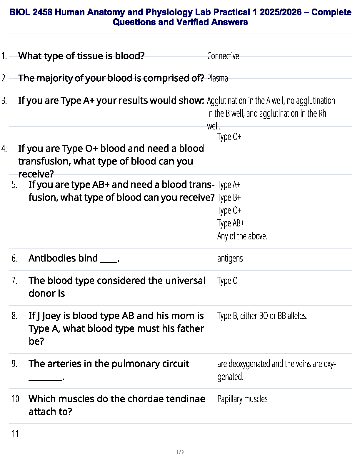 Ace your BIOL 2458 Human Anatomy and Physiology Lab Practical 1 with our comprehensive and up-to-date Test Bank for the 2025/2026 academic year. This essential study guide features a complete set of questions with 100% verified answers, meticulously designed to help you master key concepts and pass your exam on the first try. Say goodbye to resits by studying with targeted material covering critical topics such as blood tissue classification, blood typing (ABO & Rh systems), blood transfusions, immunology basics, and fundamental cardiovascular anatomy. Get the confidence you need to excel in your A&P lab practical.