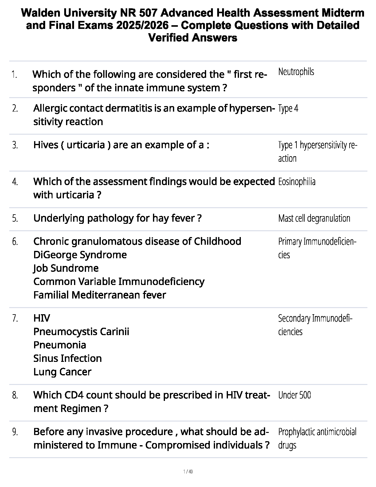 Prepare to excel in your Walden University course with our latest 2025/2026 study guide for NR 507 Advanced Health Assessment. This comprehensive resource features a full collection of midterm and final exam questions, complete with verified and detailed answers. It's the ultimate tool designed to help you master complex topics, boost your confidence, and pass your exams on the very first try. Avoid the stress of resits and secure top grades with this essential study companion.