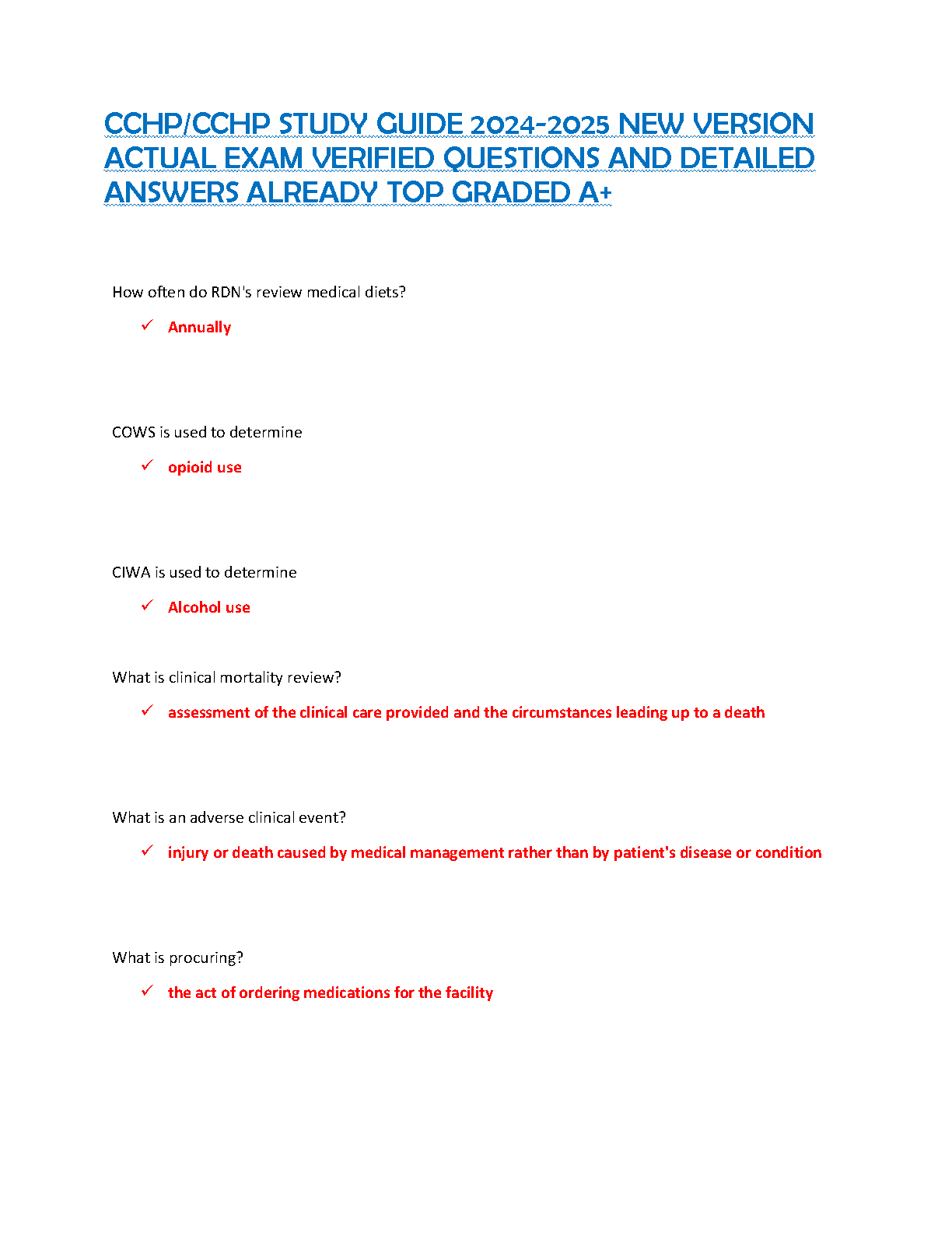 Unlock your potential and secure your CCHP certification with our meticulously crafted 2025/2026 study guide. This comprehensive resource is your key to passing the Certified Correctional Health Professional exam on your very first try. Inside, you'll find a powerhouse of verified questions paired with detailed, accurate answers, covering essential topics from clinical assessment tools like COWS and CIWA to critical procedures like mortality reviews and medication procurement. This top-graded A+ test bank is designed to build your confidence and ensure you walk into the exam fully prepared. Don't leave your success to chance—invest in this guide and avoid the stress of resits!
