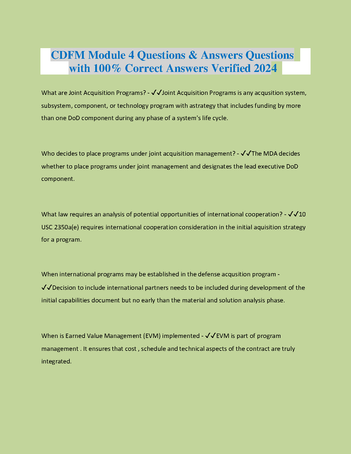 Ace your Certified Defense Financial Manager (CDFM) certification with our complete Test Bank for Module 4, updated for 2024. This essential study guide provides a full range of exam questions paired with 100% correct and verified answers. Focus your preparation on key areas like Acquisition Business Management, Joint Acquisition Programs, and Earned Value Management (EVM). Designed for success, this resource will help you master the material efficiently, pass your exam on the first attempt, and advance your career in defense financial management.