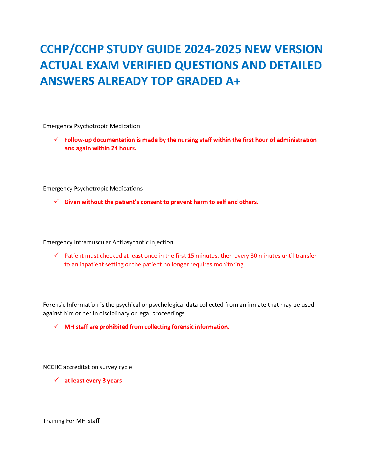 Prepare to ace the Certified Correctional Health Professional (CCHP) exam with our comprehensive 2024-2025 study guide. This new version is expertly curated with actual exam questions and detailed, verified answers that have already been top-graded. Our resource is designed to be your ultimate tool for success, covering all critical topics based on the latest NCCHC standards. Dive into key areas such as emergency psychotropic medication administration, patient monitoring protocols, handling of forensic information, and NCCHC accreditation cycles. With this guide, you can study confidently, understand the material deeply, and pass the CCHP exam on your very first try, avoiding costly and time-consuming resits. Get the A+ grade you deserve and take the next step in your correctional healthcare career.