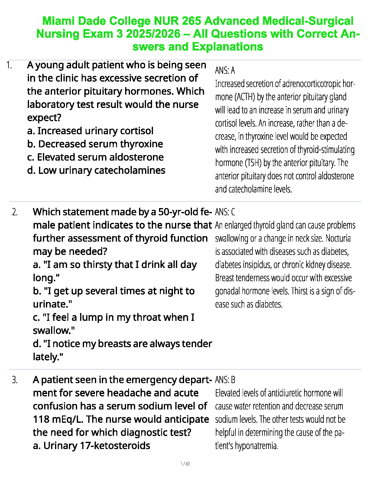 Ace your NUR 265 Advanced Medical-Surgical Nursing Exam 3 at Miami Dade College with our comprehensive 2025/2026 test bank. This essential study guide features a complete collection of exam questions, each paired with a correct answer and a detailed explanation to deepen your understanding. Designed to cover all key topics for Exam 3, this resource helps you identify your strengths and weaknesses, practice with realistic exam-style questions, and master the material needed to pass on your first attempt. Get instant access to this verified Q&A and boost your confidence for success!