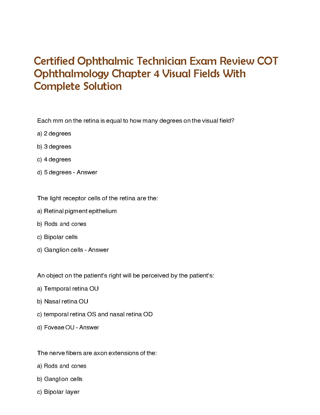 Test Bank for Certified Ophthalmic Technician Exam Review Manual, 3rd Edition by Janice K. Ledford - Chapter 4 Visual Fields with Complete Solutions
