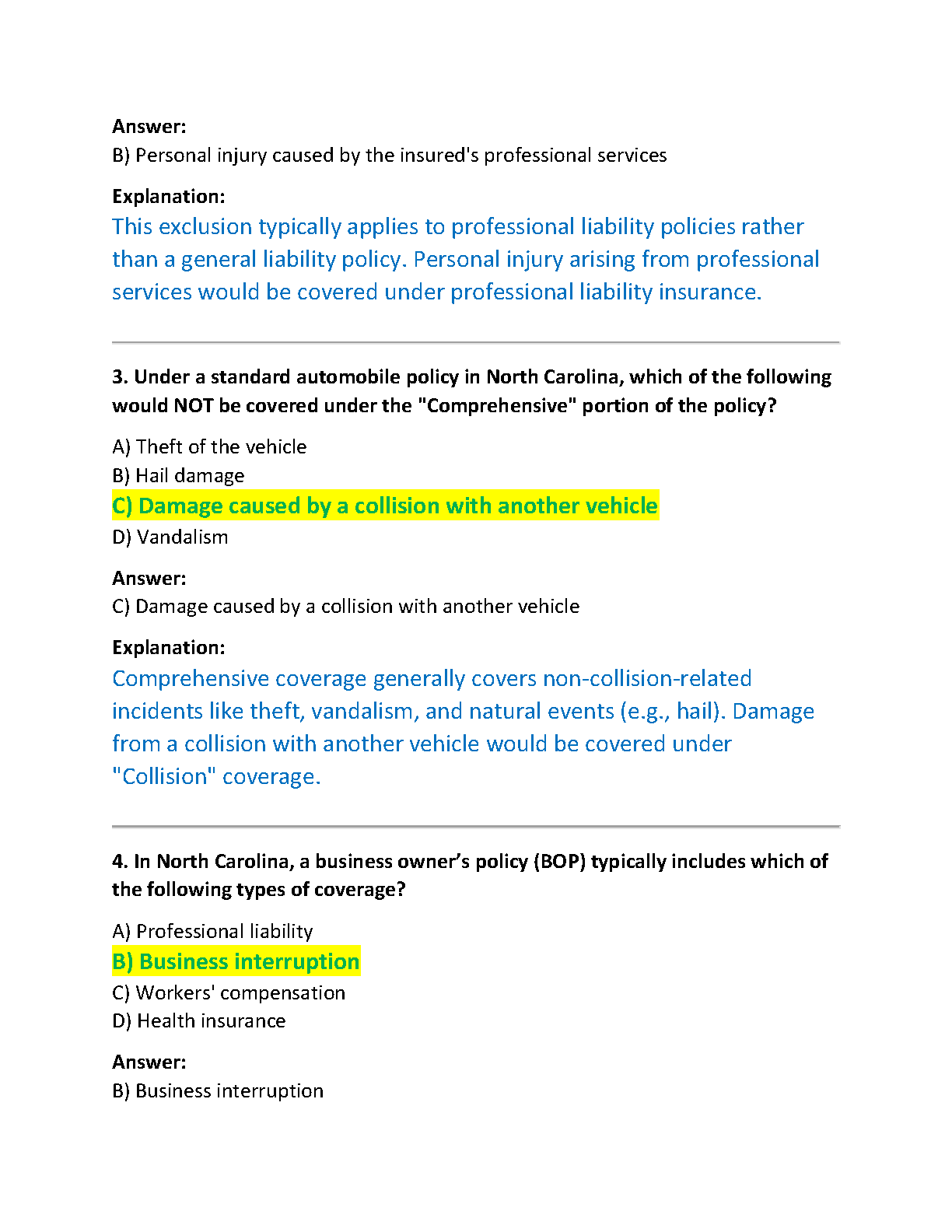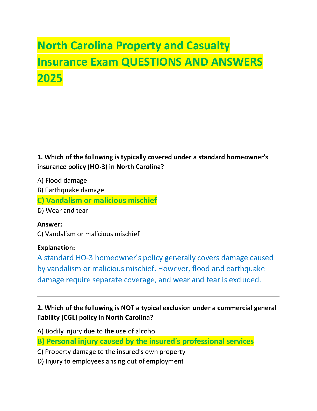 North Carolina Property and Casualty Insurance Exam 2025 Test Bank: Verified Questions and Answers to Help You Pass on the First Attempt