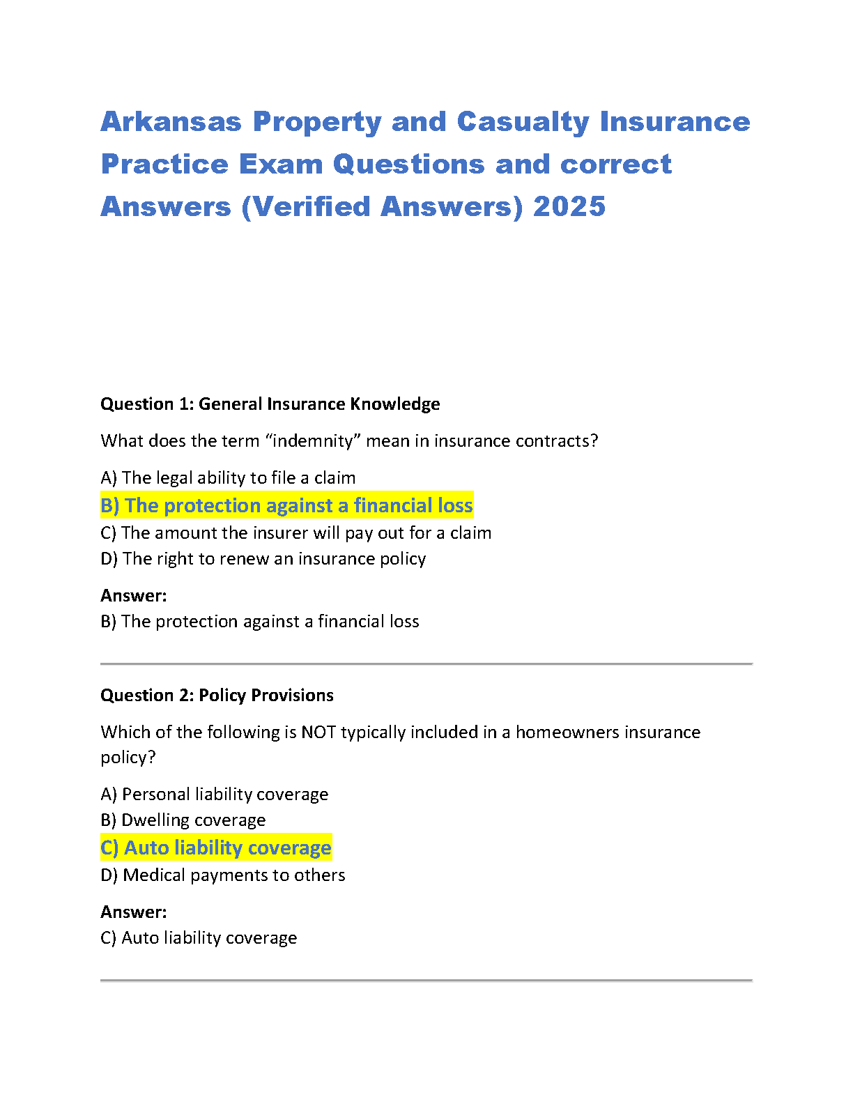 Ace your Arkansas Property and Casualty Insurance license exam with our comprehensive 2025 test bank. This essential study guide is packed with practice exam questions and verified, correct answers to ensure you have a thorough understanding of all key concepts. Covering critical topics like General Insurance Knowledge and Policy Provisions, this resource is expertly designed to help you prepare effectively, boost your confidence, and pass your certification on the very first try. Avoid resits and launch your insurance career successfully with this ultimate preparation tool.