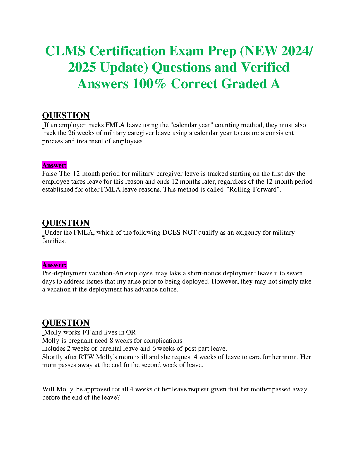 Ace your Certified Leave Management Specialist (CLMS) exam with our comprehensive test bank, fully updated for the 2024/2025 testing cycle. This essential study resource features a complete collection of exam-style questions paired with expertly verified answers, designed to mirror the actual CLMS certification test. Master complex topics like FMLA regulations, military leave, and various leave scenarios to ensure you're fully prepared. Our proven 'Graded A' materials are structured to help you pass on your very first attempt, saving you time and the stress of resits. Get immediate access to the questions and answers you need to achieve your CLMS certification confidently.