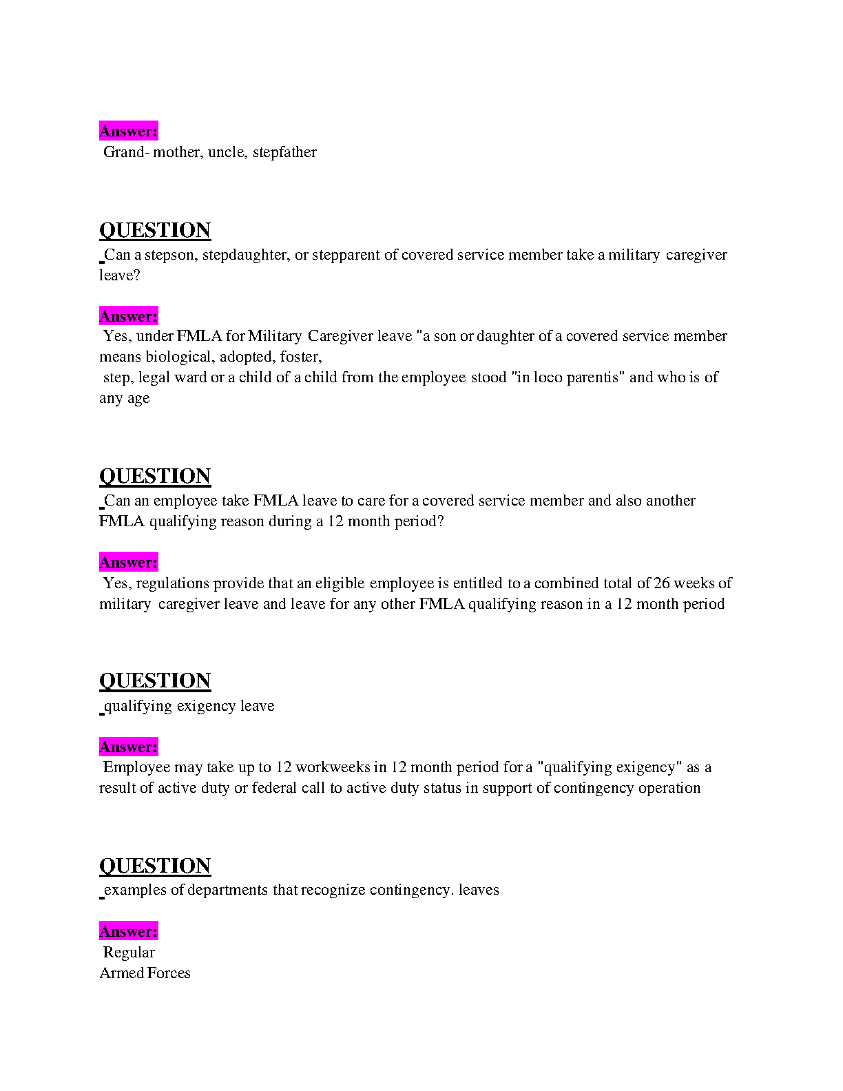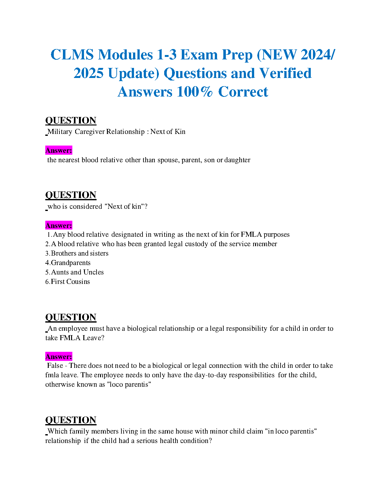 Ace your CLMS exam covering Modules 1-3 with our comprehensive test bank, fully updated for the 2024/2025 assessment period. This premium resource features an extensive collection of exam-style questions paired with 100% correct, verified answers. Master key topics including the Family and Medical Leave Act (FMLA), Military Caregiver leave, the definition of 'Next of Kin,' and the 'in loco parentis' doctrine. This study guide is expertly crafted to help you understand the material, build confidence, and pass your CLMS certification on the first attempt.