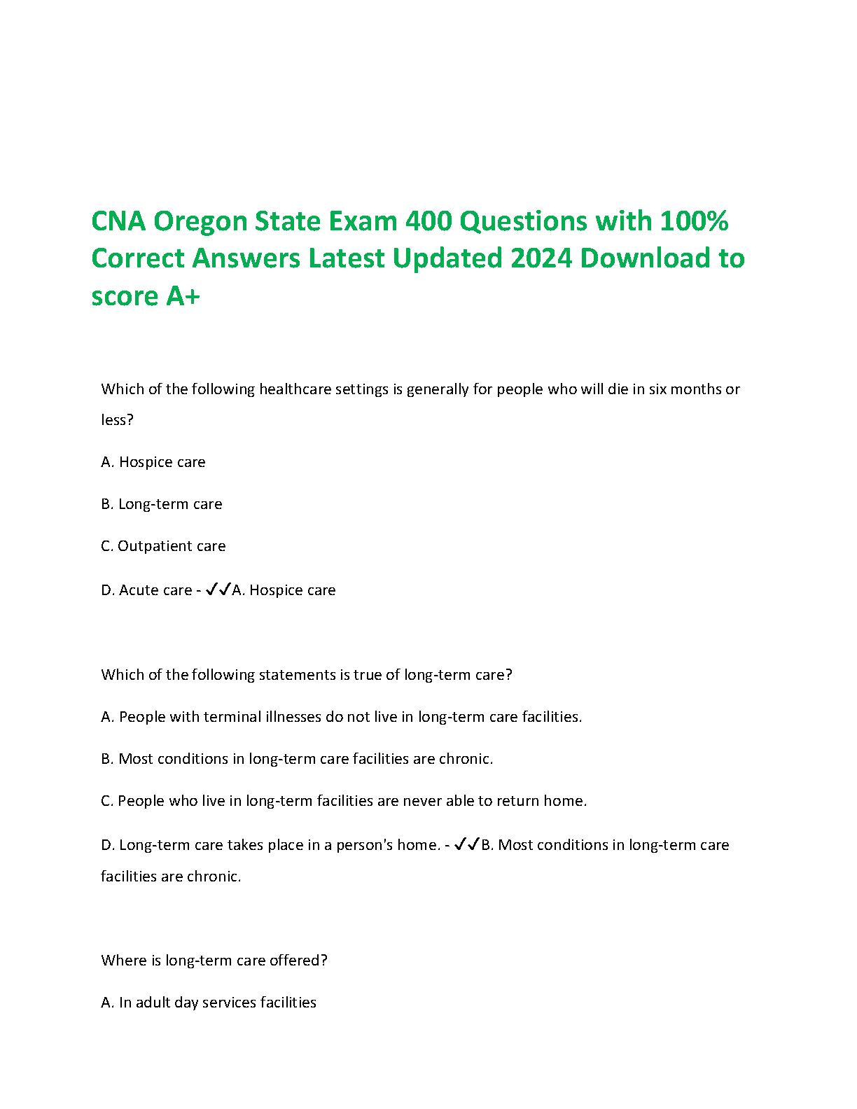 Oregon State CNA Exam 2024 Test Bank: Master 400 Questions with 100% Verified Answers to Achieve an A+