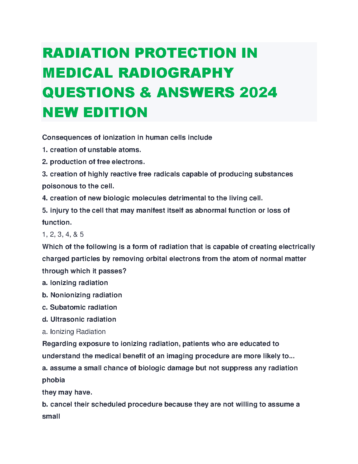 Master the principles of radiation safety and excel in your coursework with the comprehensive Test Bank for 'Radiation Protection in Medical Radiography,' 8th Edition by Sherer, Visconti, Ritenour, and Haynes. This essential study tool provides a full collection of exam-style questions and verified answers, covering all key topics from the textbook. Deepen your understanding of ionization, patient care, and safety protocols to ensure you pass your exams on the first attempt. This resource is expertly designed to help you avoid resits and confidently prepare for a successful career in medical radiography.