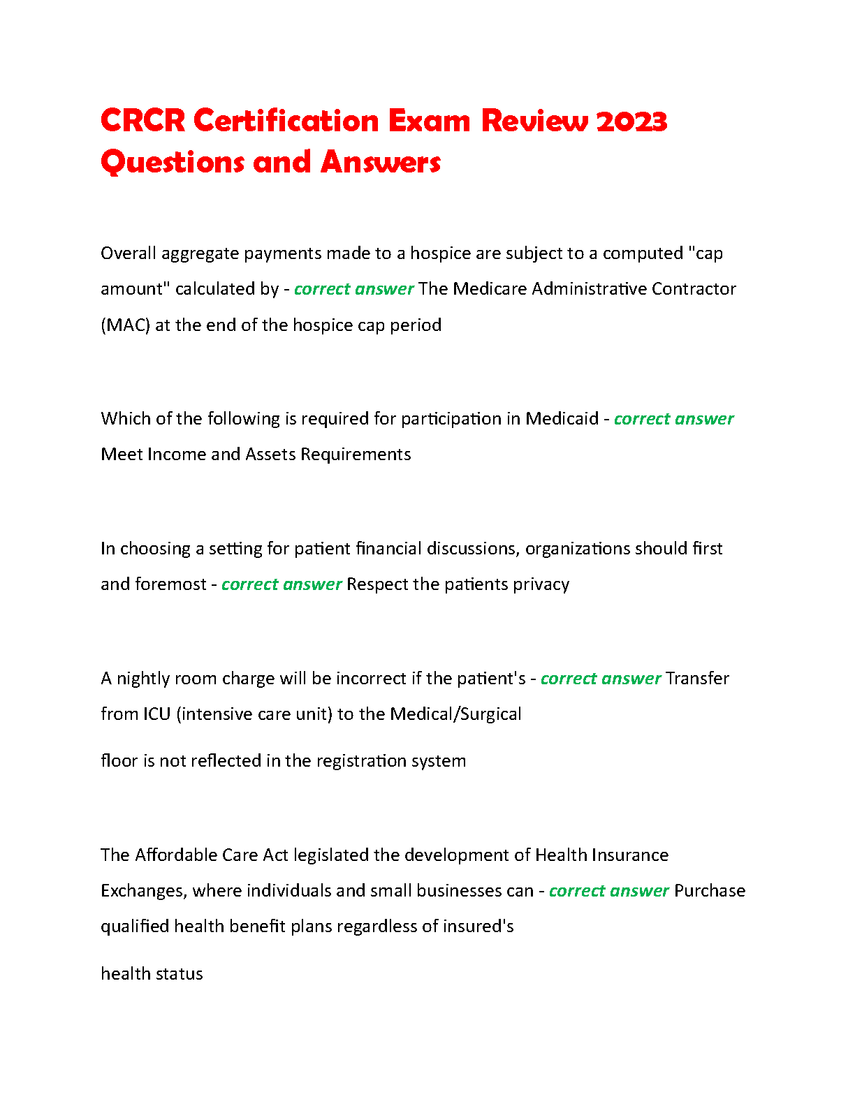 CRCR Certified Revenue Cycle Representative Exam Test Bank 2024-2025 | Verified Questions and Answers by HFMA