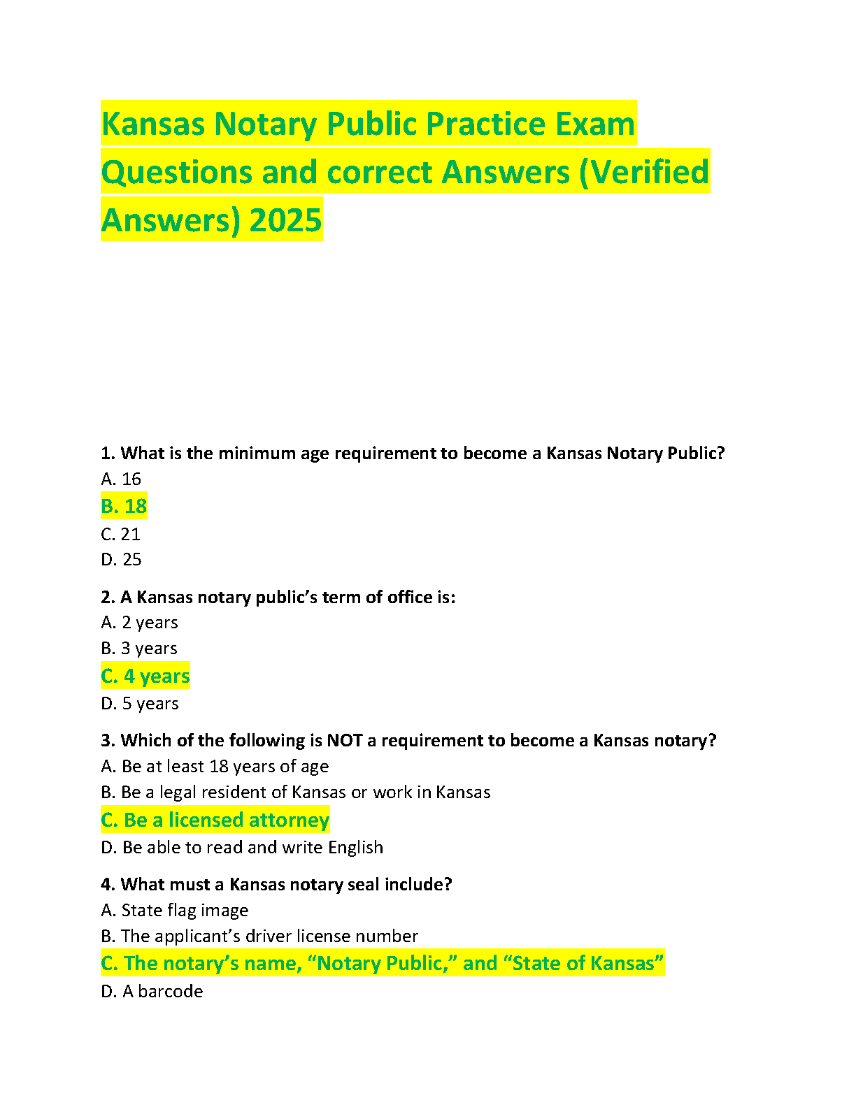 Kansas Notary Public Practice Exam 2025/2026: Comprehensive Questions & Verified Answers to Pass on Your First Attempt