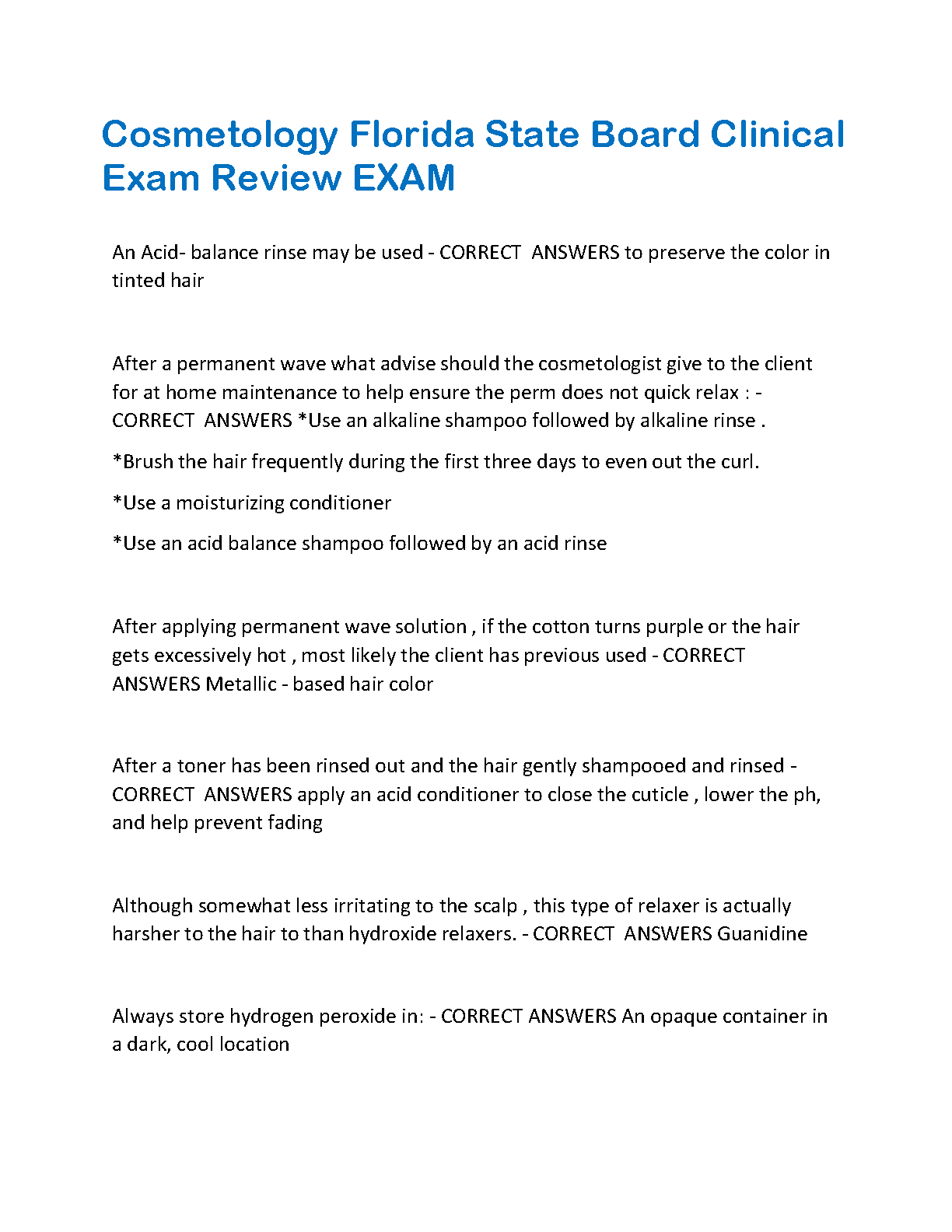Florida State Board of Cosmetology Clinical Exam Test Bank | Latest Edition with Verified Questions and Answers