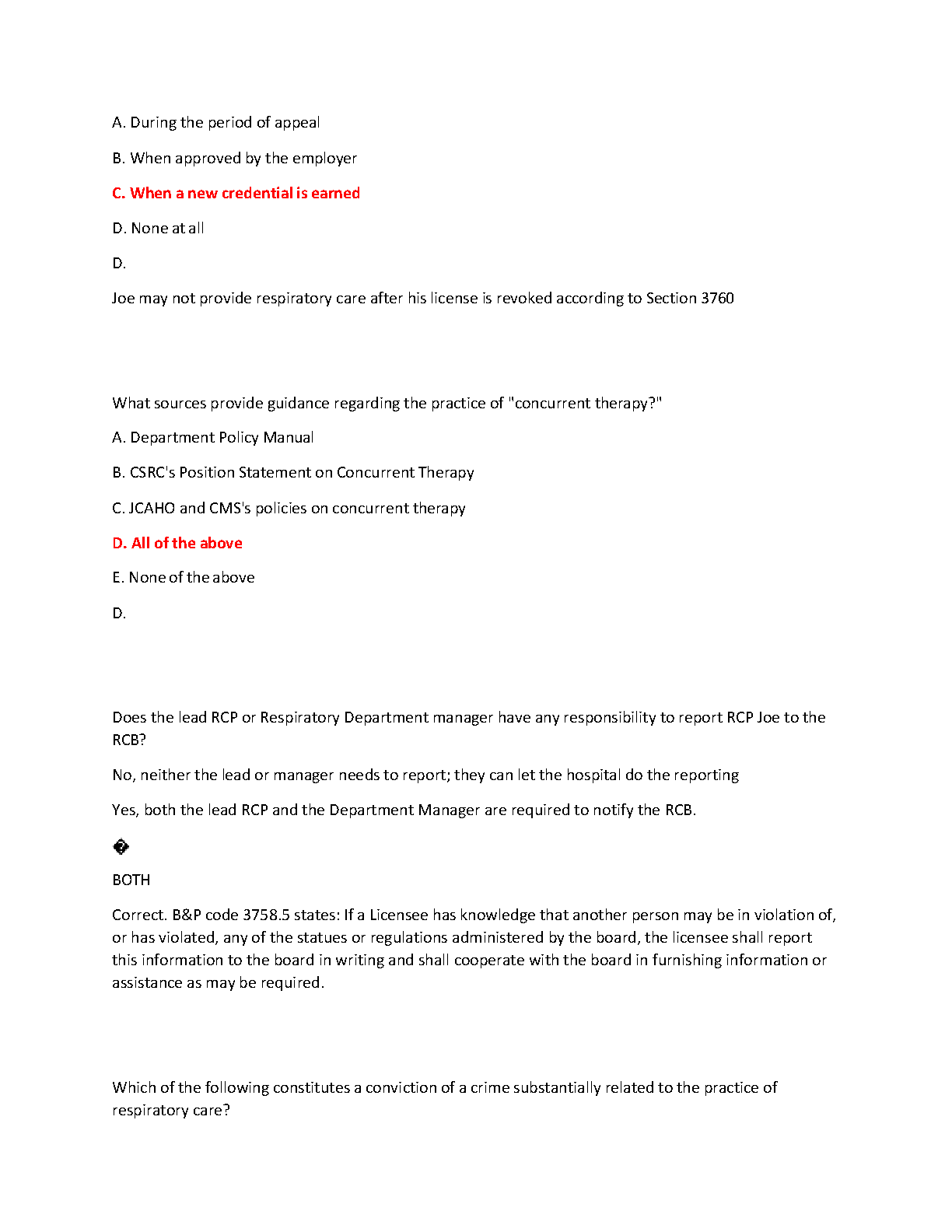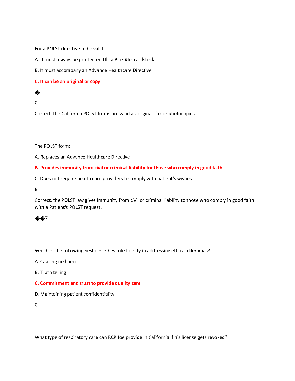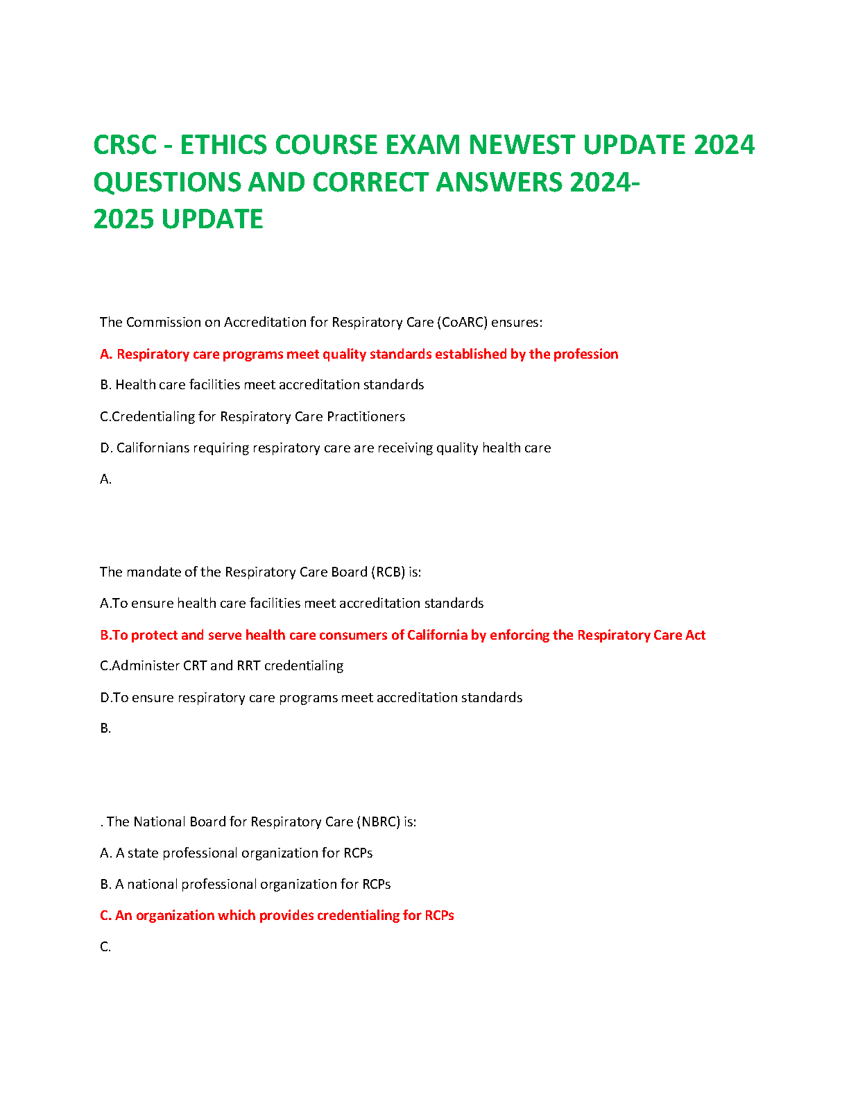 Prepare to ace your California Respiratory Care Society (CRSC) Ethics Course Exam with our meticulously compiled 2024-2025 test bank. This essential study resource features an extensive collection of the most current exam questions, complete with verified and accurate answers. Designed to help you master the material efficiently, this guide covers critical topics about the CoARC, RCB, and NBRC. Pass your ethics exam on the first attempt and fulfill your continuing education requirements without the stress of resits. Download now for instant access to your key to success.