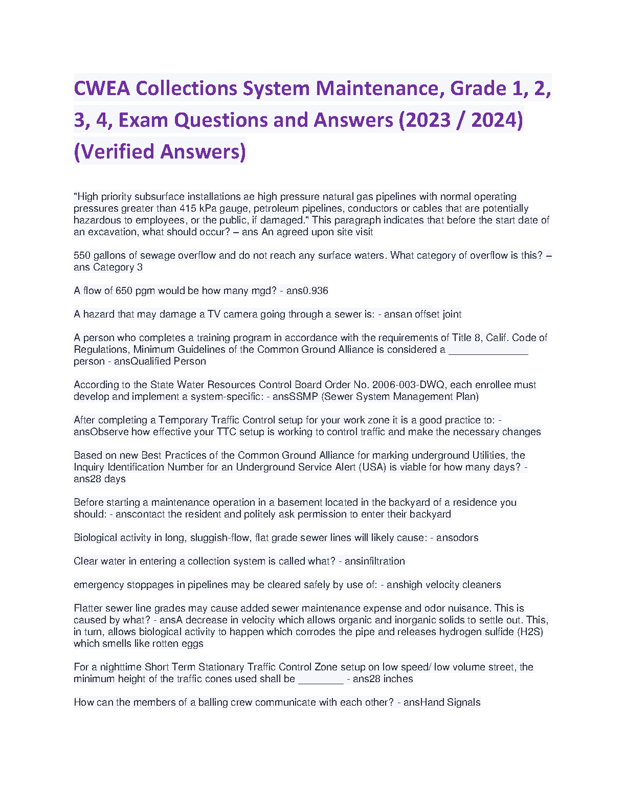 CWEA Collections System Maintenance Grade 1-4 Certification Test Bank 2023/2024 | Complete Exam Questions and Verified Answers