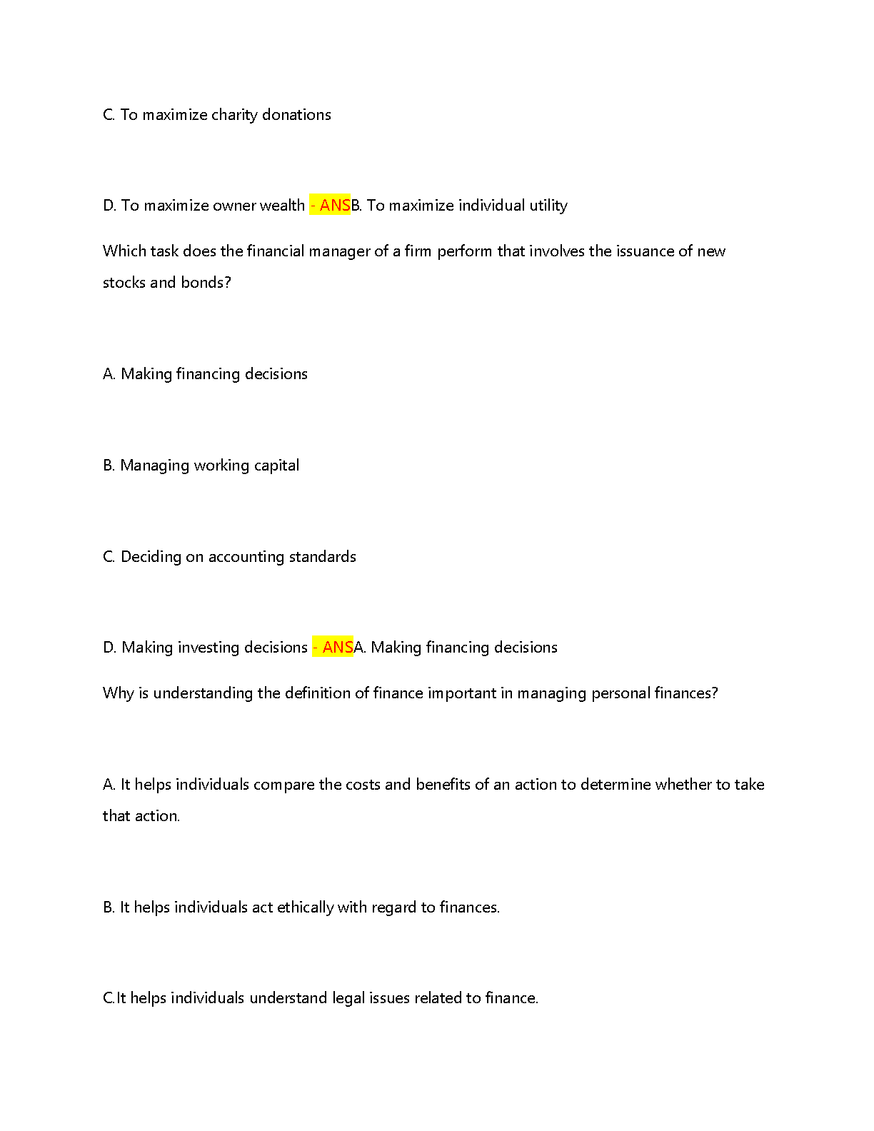 Ace your WGU D076 Finance for Managers Objective Assessment with this comprehensive test bank for the 2025/2026 academic year. This essential study guide features a complete collection of exam questions paired with 100% correct, verified answers. Designed to mirror the actual OA, our resource helps you grasp key financial concepts, practice effectively, and build the confidence you need to pass on your very first attempt. Stop worrying about resits and start preparing for success. Download now and take the first step towards mastering your finance course!