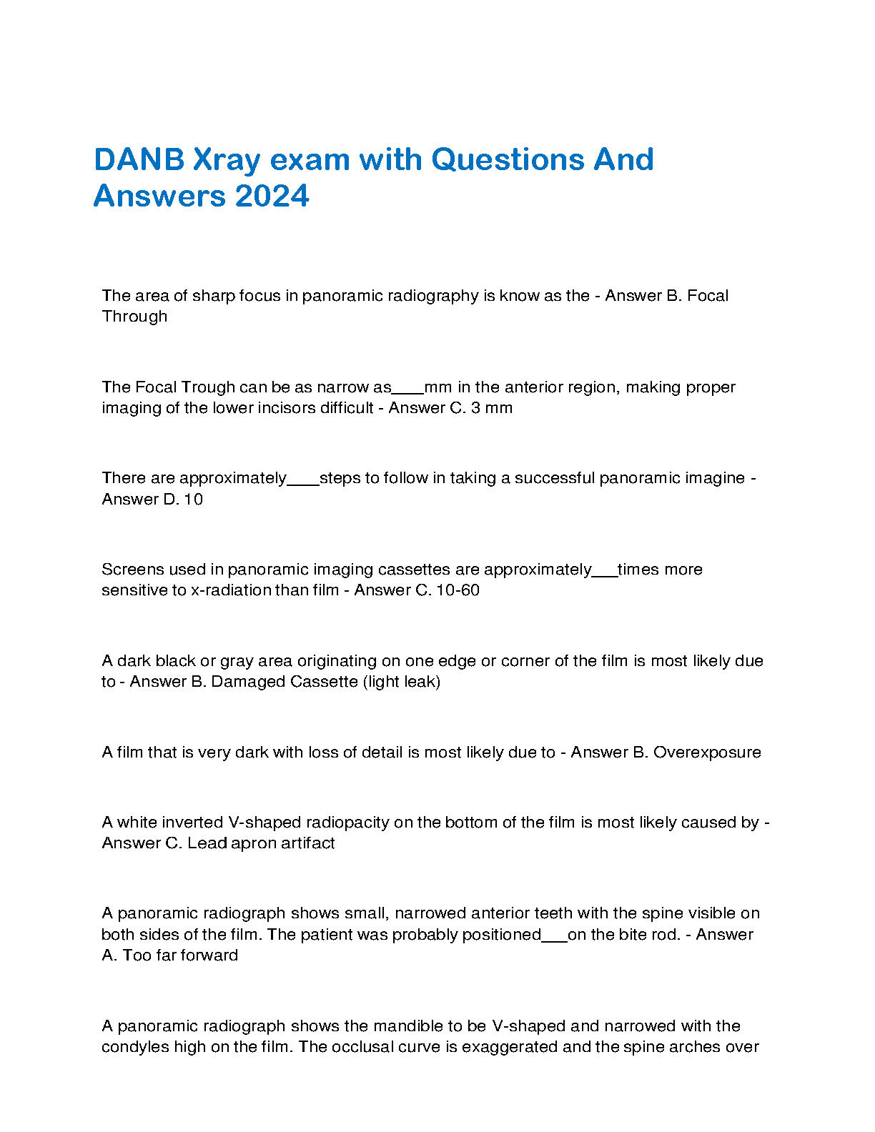 Unlock success in your dental assisting career with our latest 2025/2026 DANB X-ray (RHS) Exam Test Bank. This essential resource is packed with a comprehensive collection of exam-style questions and expertly verified answers, designed to help you master the material and pass on your very first attempt. Dive deep into critical topics such as panoramic radiography, identifying film artifacts, patient positioning errors, and safety protocols. Avoid the stress of resits by studying with the most up-to-date and relevant questions that mirror the actual DANB certification exam. Get the confidence you need to excel!