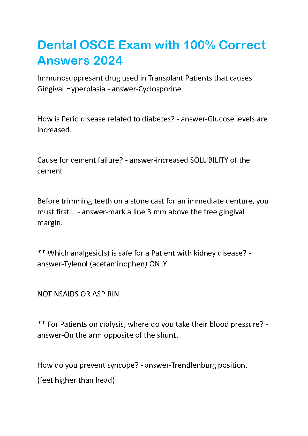 Ace your upcoming Dental OSCE exam with confidence! This is a meticulously compiled test bank for the 2025/2026 academic year, featuring a comprehensive collection of questions and 100% verified correct answers. Our guide covers crucial topics frequently tested in the Dental OSCE, including pharmacology, the link between systemic conditions like diabetes and periodontal disease, clinical procedures, patient management, and handling medical emergencies. This resource is your ultimate tool to master key concepts, pass the Dental OSCE on your first try, and avoid costly resits.