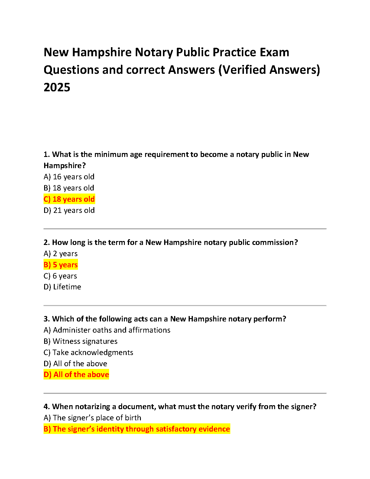 Get ready to ace your New Hampshire Notary Public exam with our comprehensive 2025 test bank. This essential study guide features a complete set of practice questions covering all key topics, complete with verified, correct answers. Designed to simulate the real exam experience, this resource will help you master the material, build your confidence, and pass on your first attempt. Stop worrying about resits and start your journey to becoming a commissioned Notary Public in New Hampshire today!