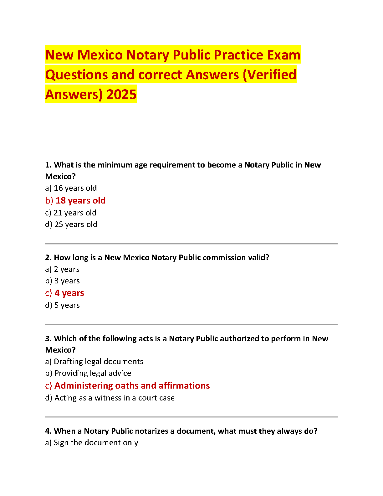 Latest 2025/2026 New Mexico Notary Public Exam Test Bank | Verified Questions & Correct Answers for First-Time Pass Success