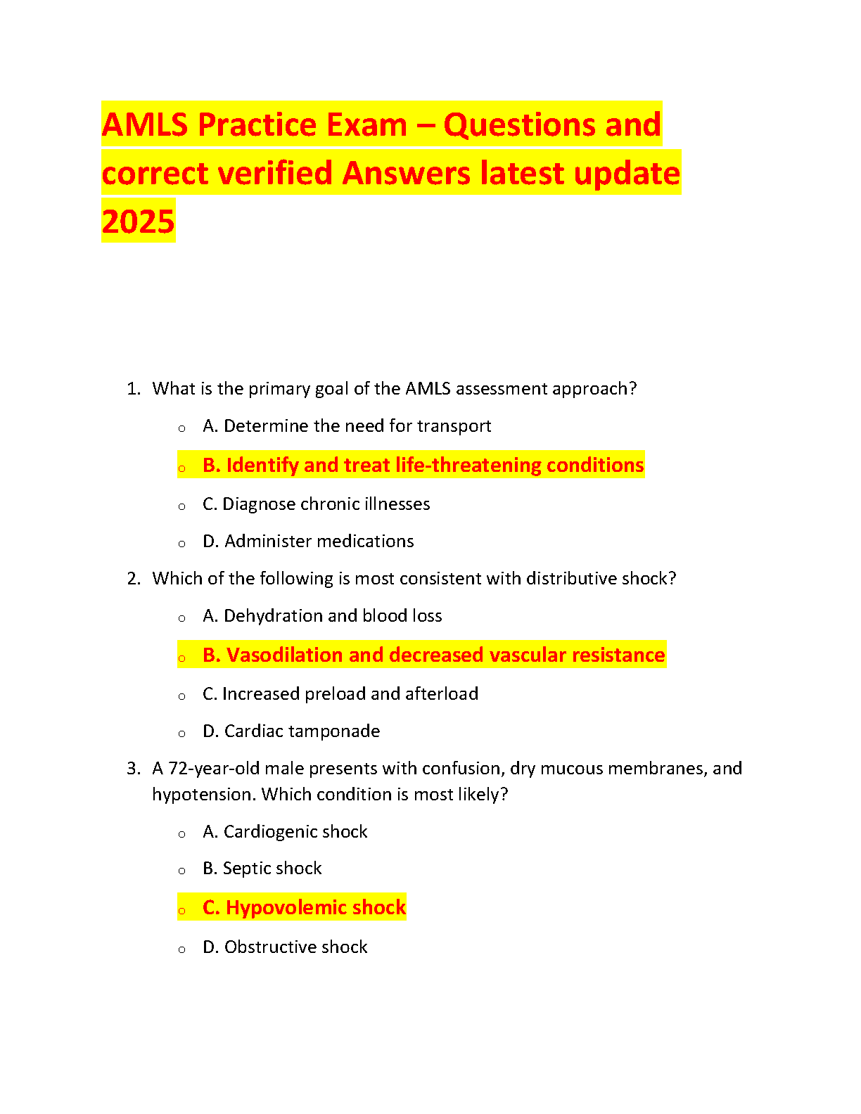 Prepare to excel in your Advanced Medical Life Support (AMLS) certification with our meticulously crafted 2025/2026 practice exam, fully aligned with the NAEMT's Third Edition textbook. This essential study resource provides a comprehensive collection of questions accompanied by 100% correct, verified answers, covering all critical topics you'll face on the real test. Designed to simulate the actual exam environment, our guide helps you master the AMLS assessment pathway and confidently handle complex medical emergencies. Download now to ensure you pass your AMLS exam with flying colors on your first try.