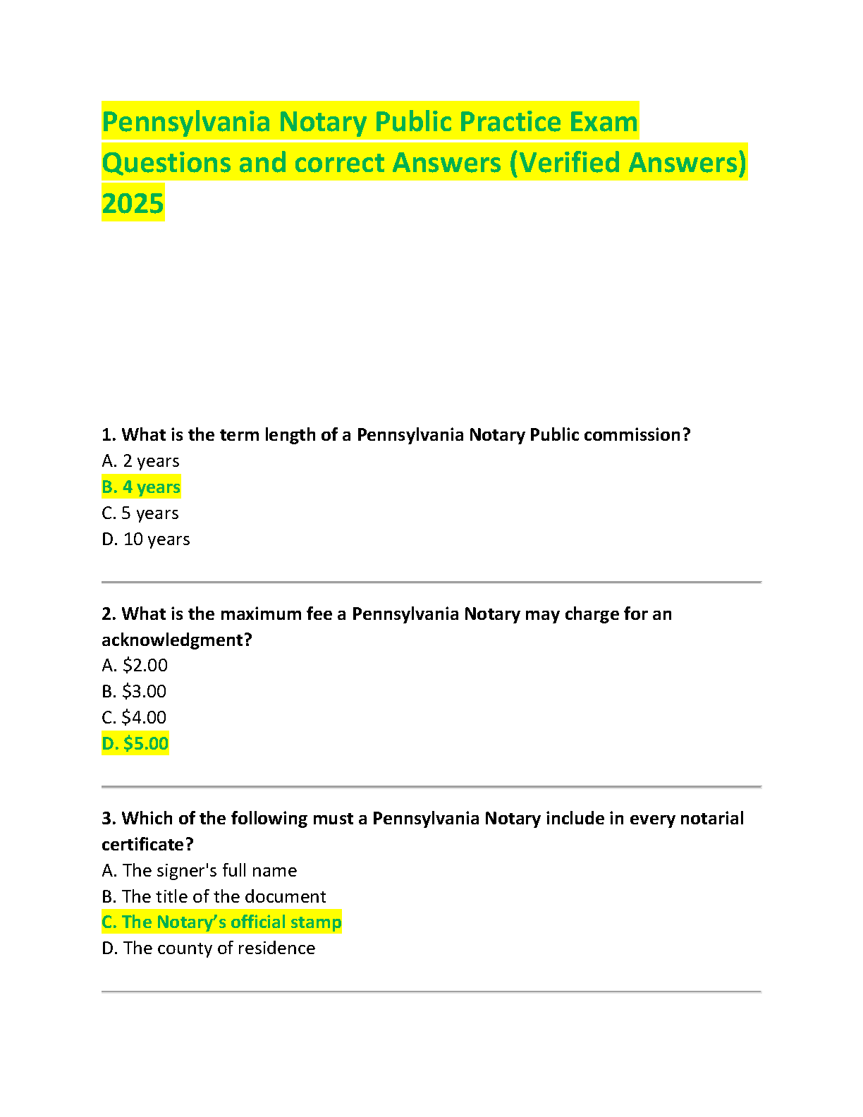 Ace your Pennsylvania Notary Public exam on the first try! This comprehensive test bank for the 2025 exam provides a full set of practice questions complete with verified answers. Master key topics such as commission term lengths, maximum allowable fees, and essential notarial certificate requirements. Our meticulously prepared resource is your ultimate guide to understanding the exam format and content, ensuring you are fully prepared to pass with confidence and avoid costly resits. Updated for the 2025 testing cycle, this study guide is the key to launching your career as a Pennsylvania Notary Public.