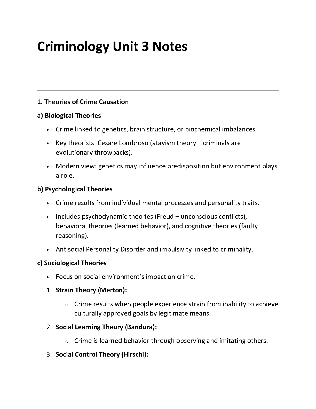 Unlock success in your Criminology course with our expertly compiled Unit 3 notes for the 2025/2026 academic year. This essential study guide provides a clear and concise breakdown of the core Theories of Crime Causation. Delve into Biological theories like Lombroso's atavism, explore Psychological perspectives including Freud's psychodynamic concepts, and grasp key Sociological theories such as Merton's Strain Theory, Bandura's Social Learning Theory, and Hirschi's Social Control Theory. These notes are structured to simplify complex concepts, making them perfect for exam revision. Secure the grade you deserve and pass on your first attempt with this indispensable resource!