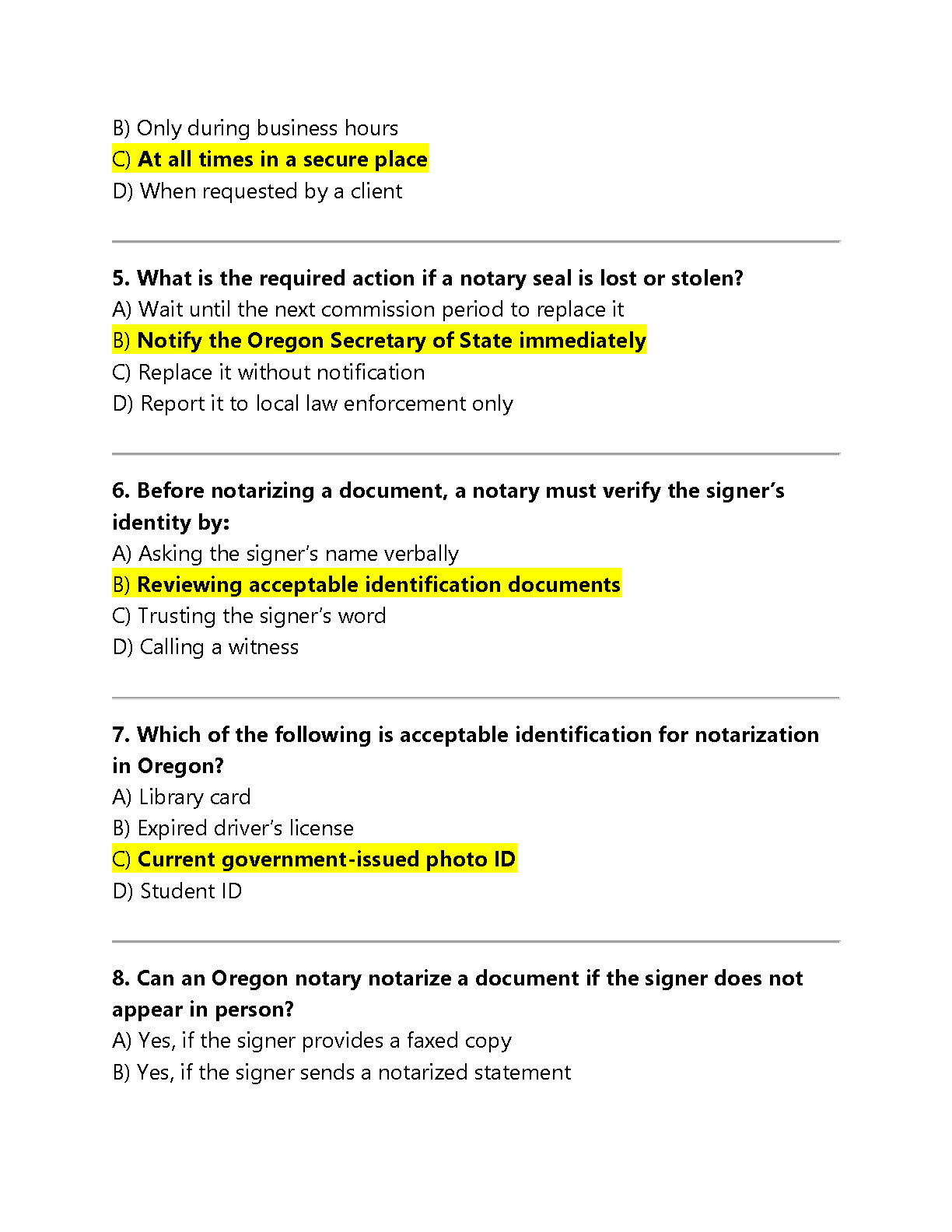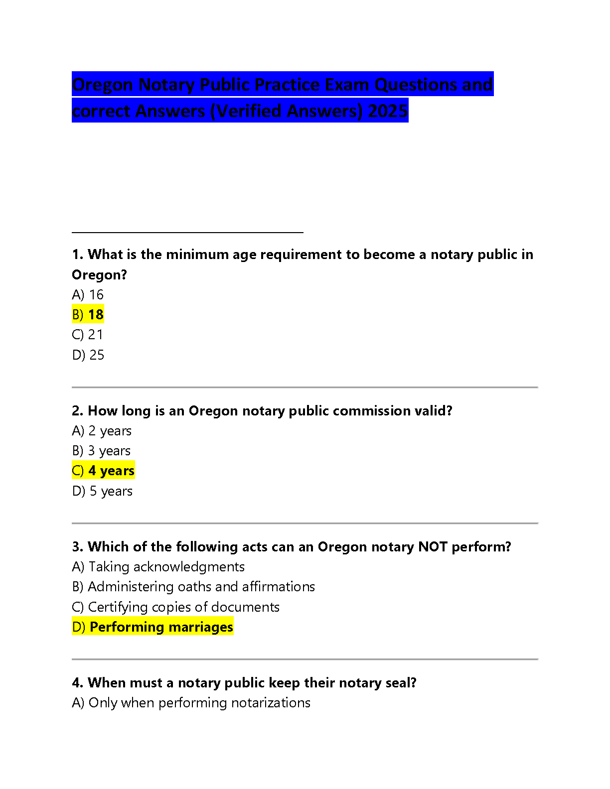Oregon Notary Public Exam 2025: Complete Test Bank with Verified Questions and Answers