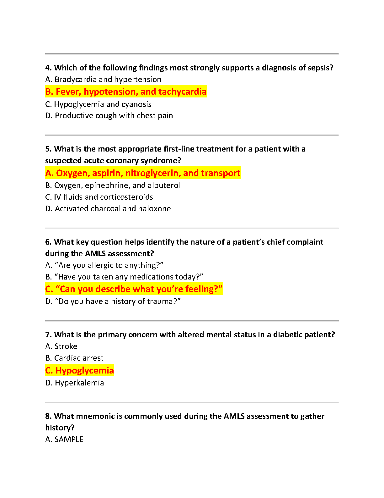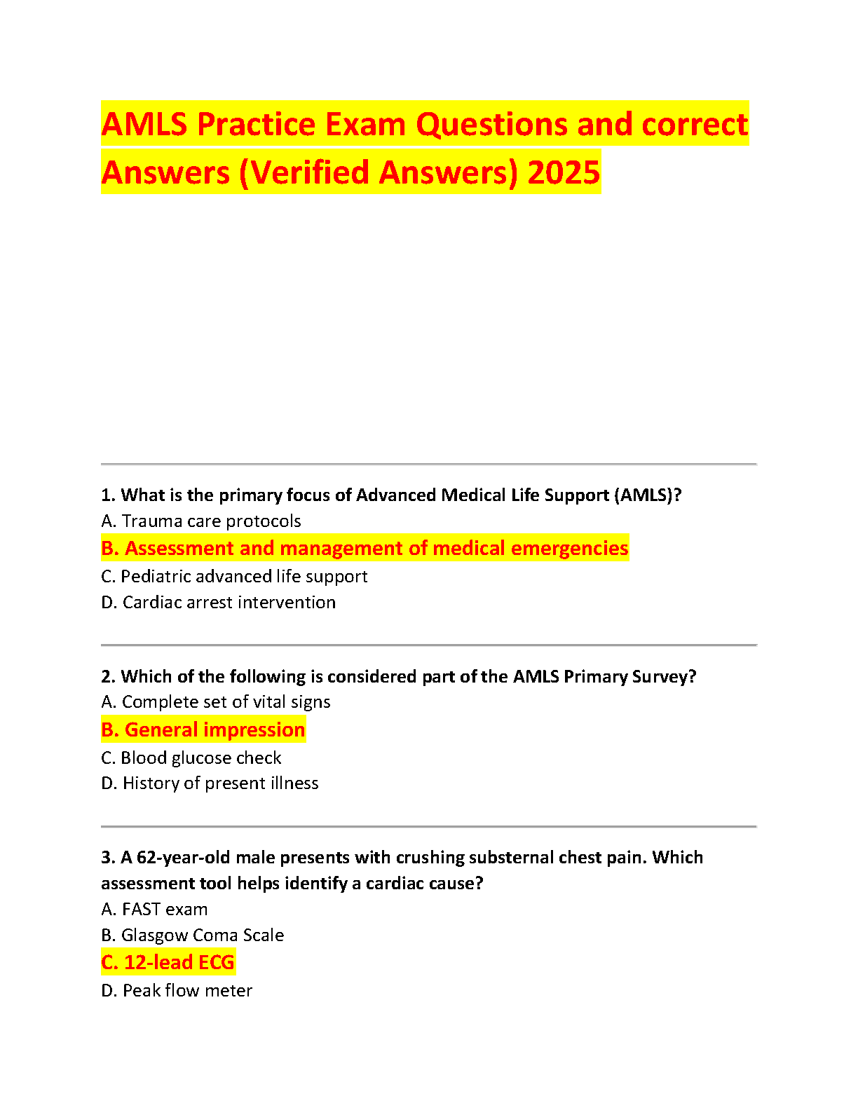 Master your Advanced Medical Life Support (AMLS) certification with our latest 2025 test bank, specifically tailored for the NAEMT's 3rd Edition textbook. This comprehensive resource features a wide array of practice exam questions, each accompanied by verified correct answers. Dive deep into crucial topics like the assessment and management of medical emergencies, the AMLS Primary Survey, and critical diagnostic tools like the 12-lead ECG. This study guide is expertly designed to help you understand the material, build confidence, and pass your AMLS exam on the very first try. Get the edge you need to succeed and avoid costly resits!
