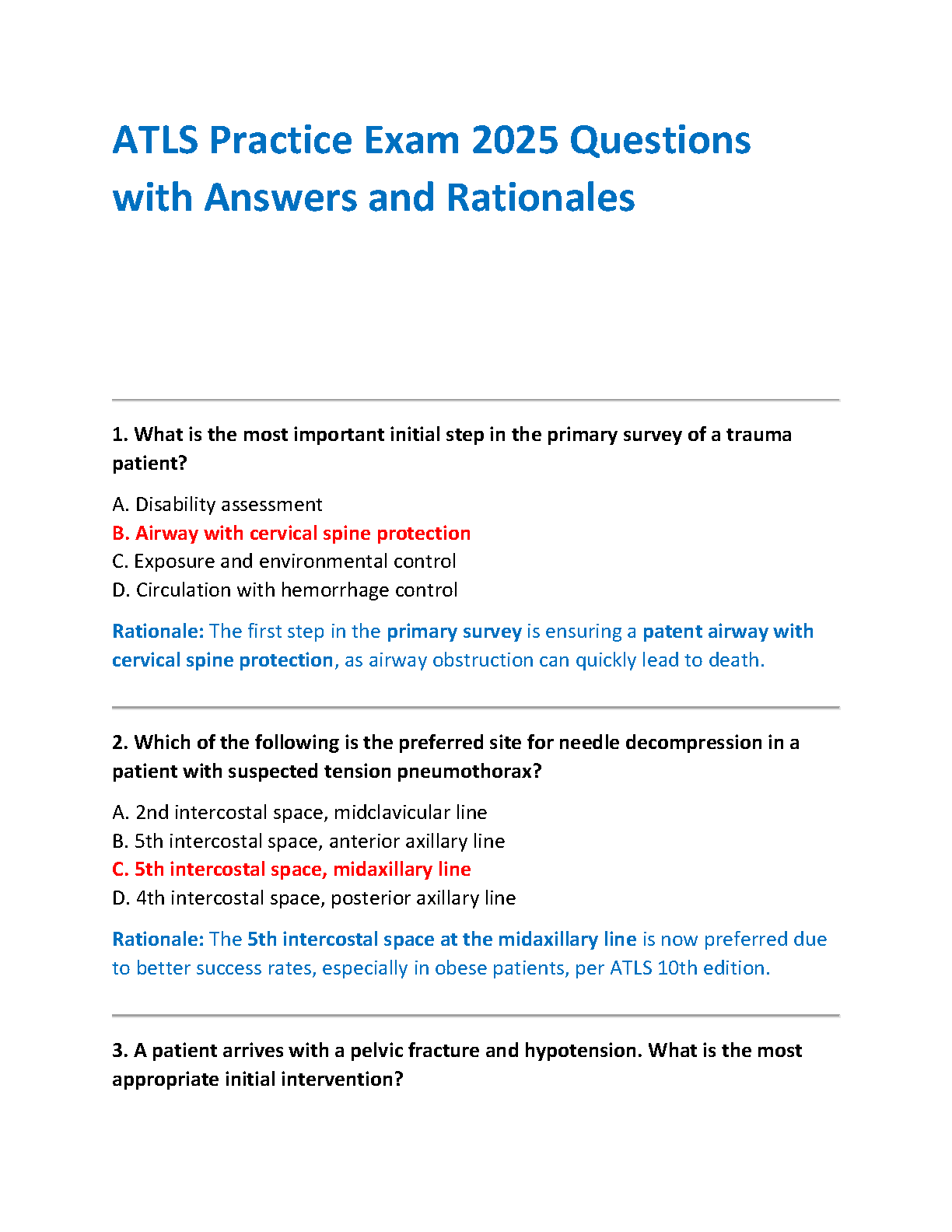 Ace your Advanced Trauma Life Support certification with our comprehensive 2025/2026 Test Bank for the ATLS 10th Edition by the American College of Surgeons. This essential study guide features a wide array of practice questions, complete with verified answers and in-depth rationales, covering all critical aspects of the ATLS curriculum. Master the primary survey, management of tension pneumothorax, and other life-saving interventions. Our up-to-date resource is expertly designed to help you pass your exam on the first attempt, build confidence, and avoid costly resits. Get instant access and start preparing for success today!
