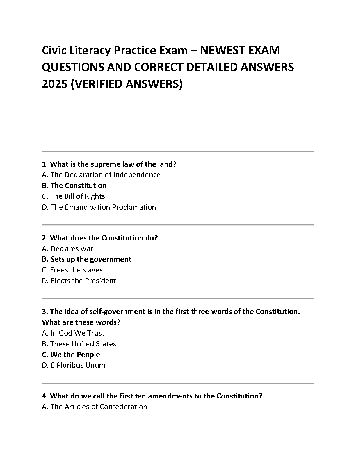 Civic Literacy Practice Exam 2025 Test Bank | US Civics Questions with Verified, Detailed Answers