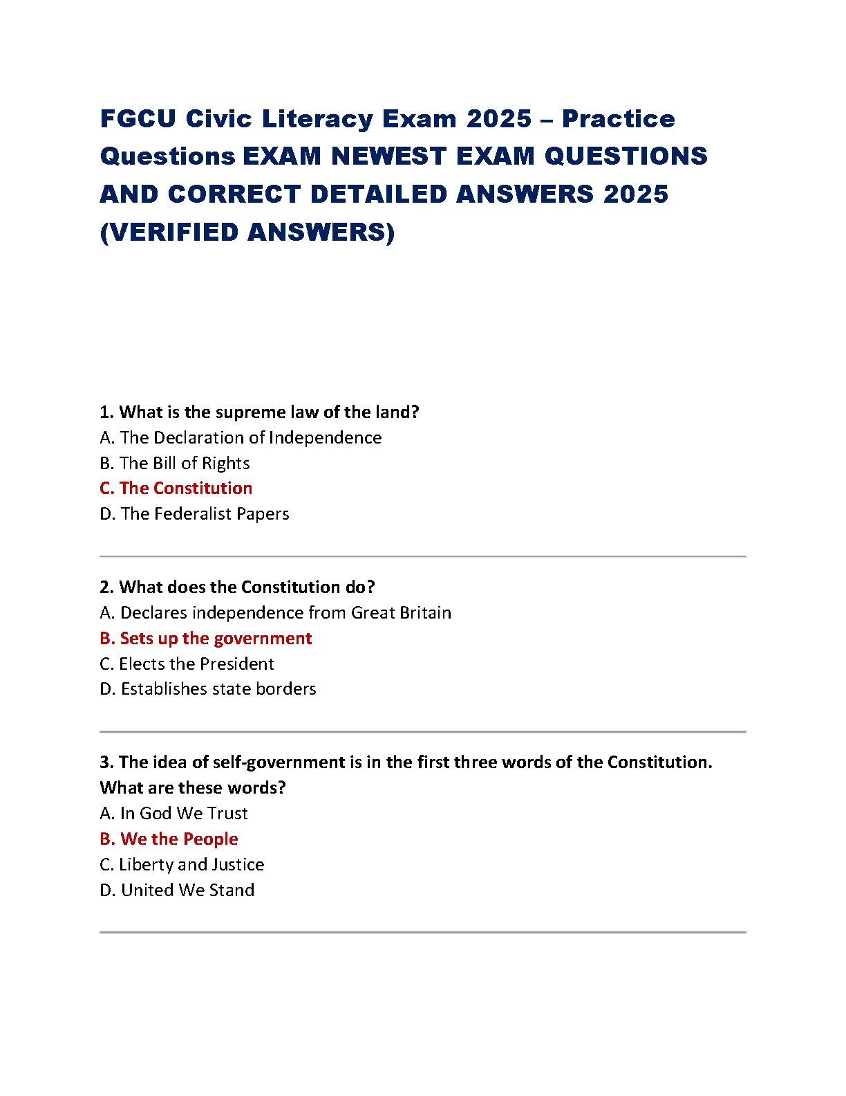 Prepare to ace your Florida Gulf Coast University (FGCU) Civic Literacy Exam with our comprehensive and up-to-date study guide for the 2025-2026 academic year. This resource features the newest set of practice questions, complete with correct, detailed, and verified answers. Designed to cover all essential topics, including the U.S. Constitution and American government, this guide is your key to understanding the material thoroughly and passing the exam on your first attempt. Avoid resits and fulfill your graduation requirement with confidence!