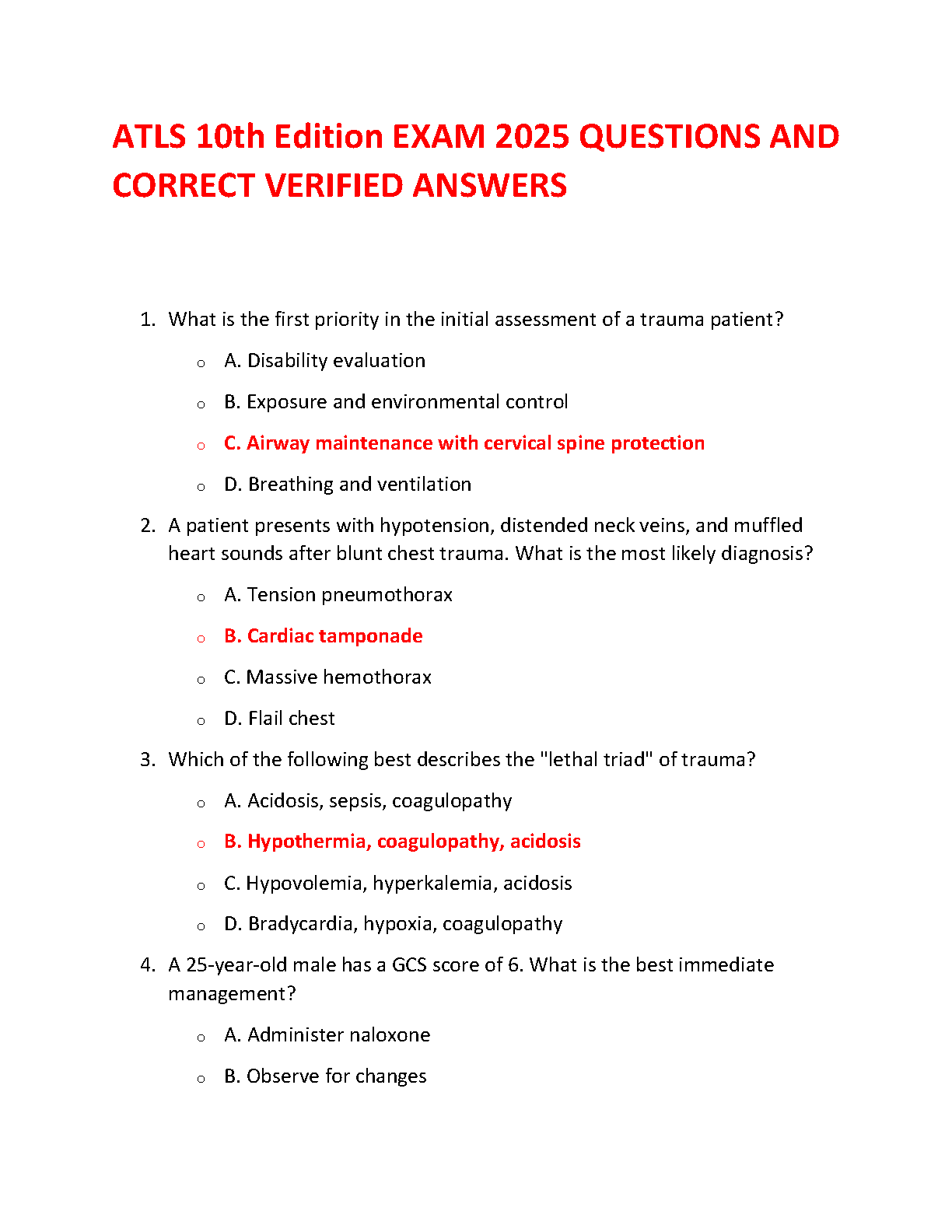 Ace your Advanced Trauma Life Support certification with our comprehensive Test Bank for the ATLS 10th Edition by the American College of Surgeons (ACS). This essential study resource provides a vast collection of exam-style questions complete with correct, verified answers. Master the critical concepts of trauma assessment and management, from primary survey to definitive care. This guide is expertly designed to help you study efficiently, build confidence, and pass your ATLS exam on the very first attempt. Get immediate access to the materials you need to succeed.