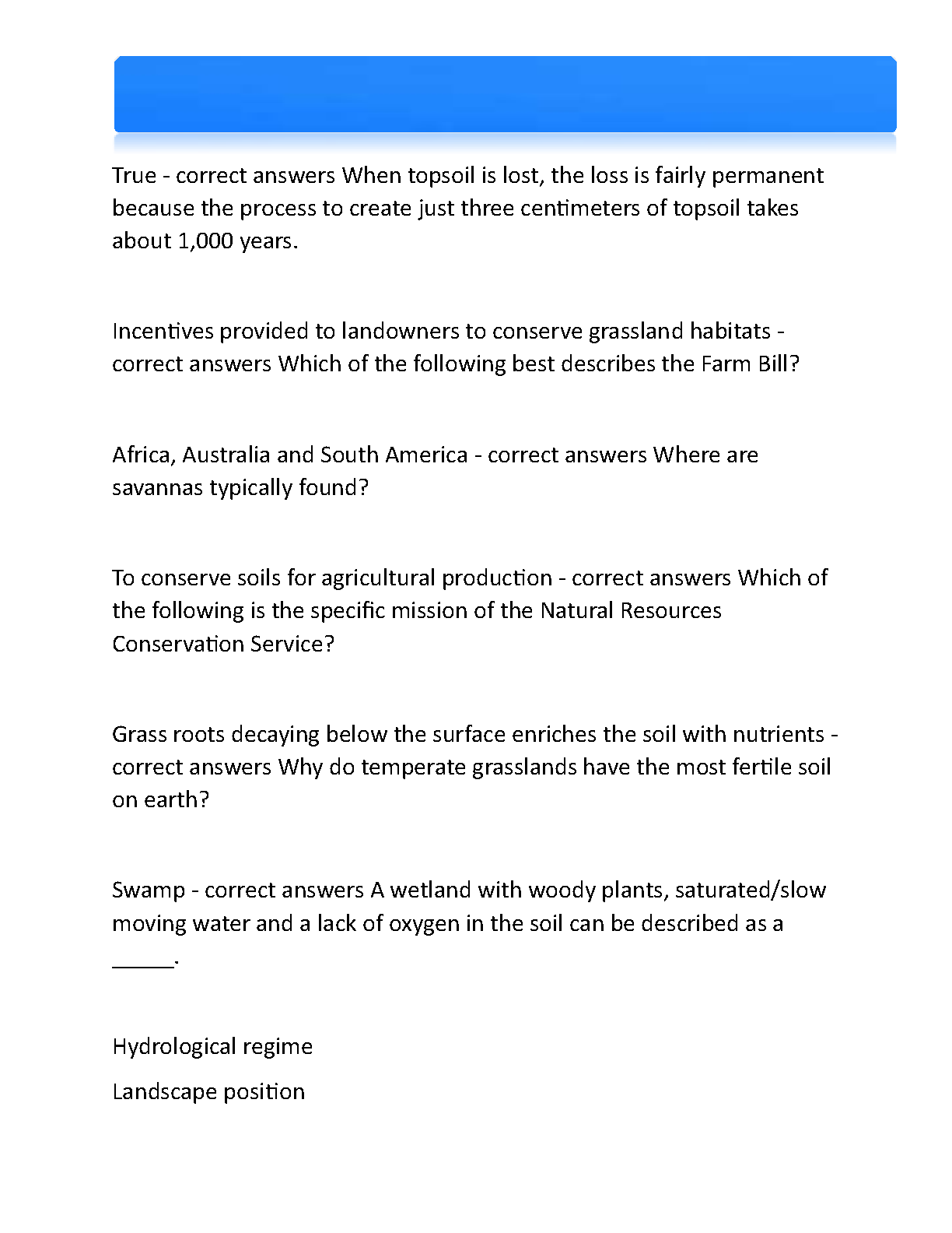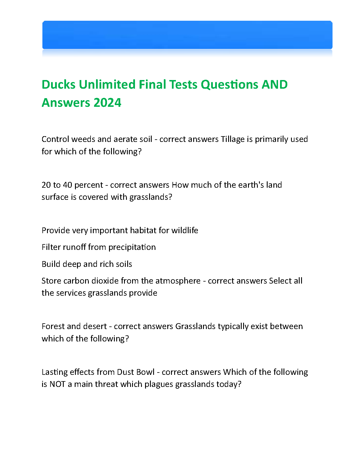 Get ready to ace your Ducks Unlimited Final Exam with our comprehensive test bank for 2024/2025. This essential study guide features a complete collection of final test questions, each paired with a detailed, verified correct answer. Our resource covers key topics such as soil management, grassland ecosystems, conservation principles, and environmental services. The clear question-and-answer format allows for efficient and effective studying, helping you master the material and approach your final test with confidence. Download now to streamline your preparation and achieve top marks!