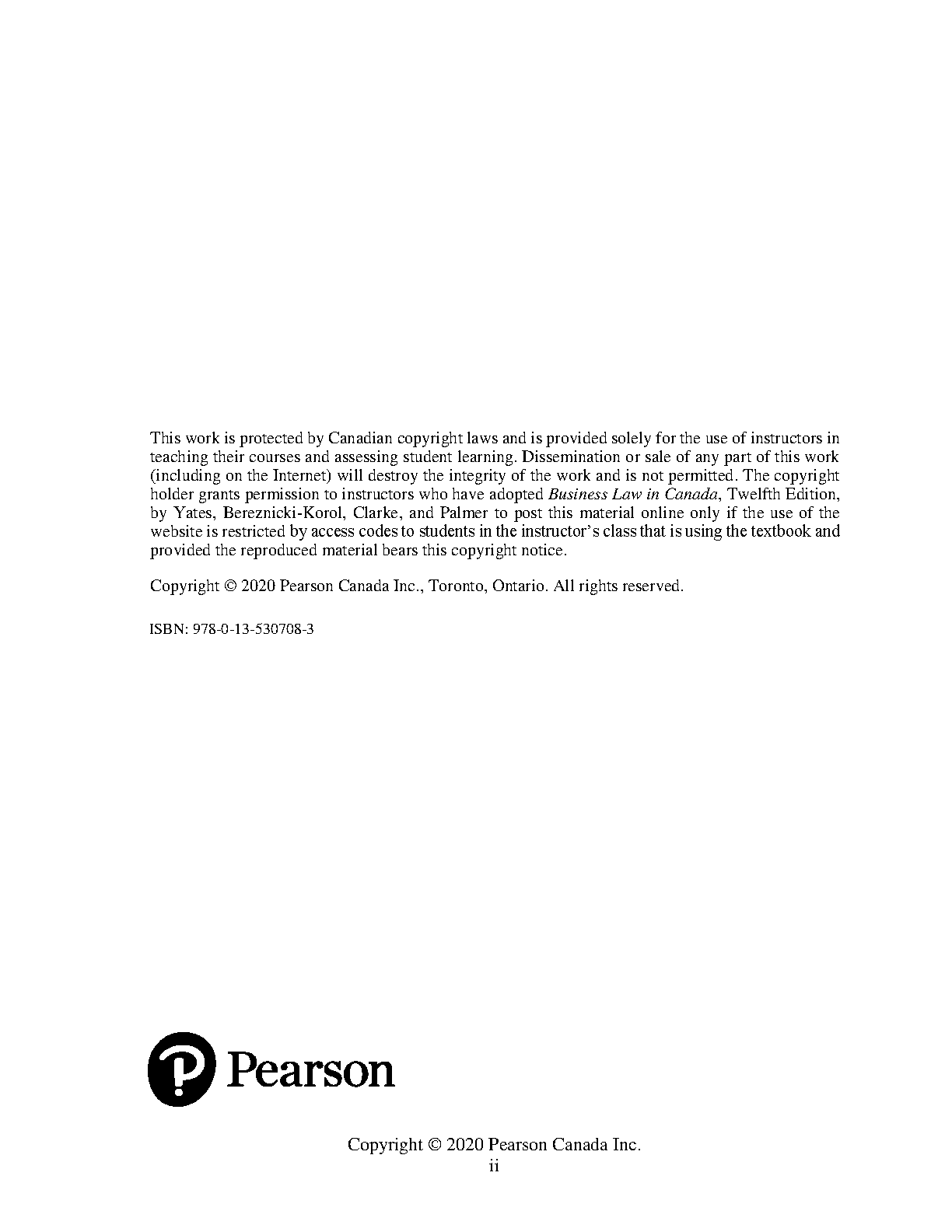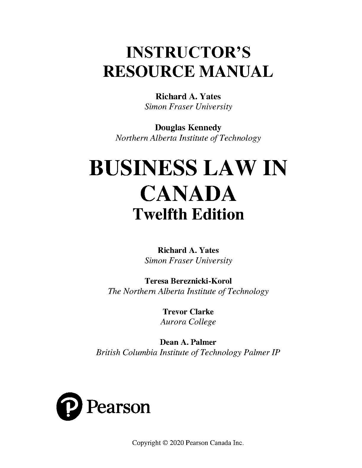 Test Bank for Business Law in Canada, 12th Edition by Richard A. Yates, Teresa Bereznicki-Korol, Trevor Clarke, Dean A. Palmer