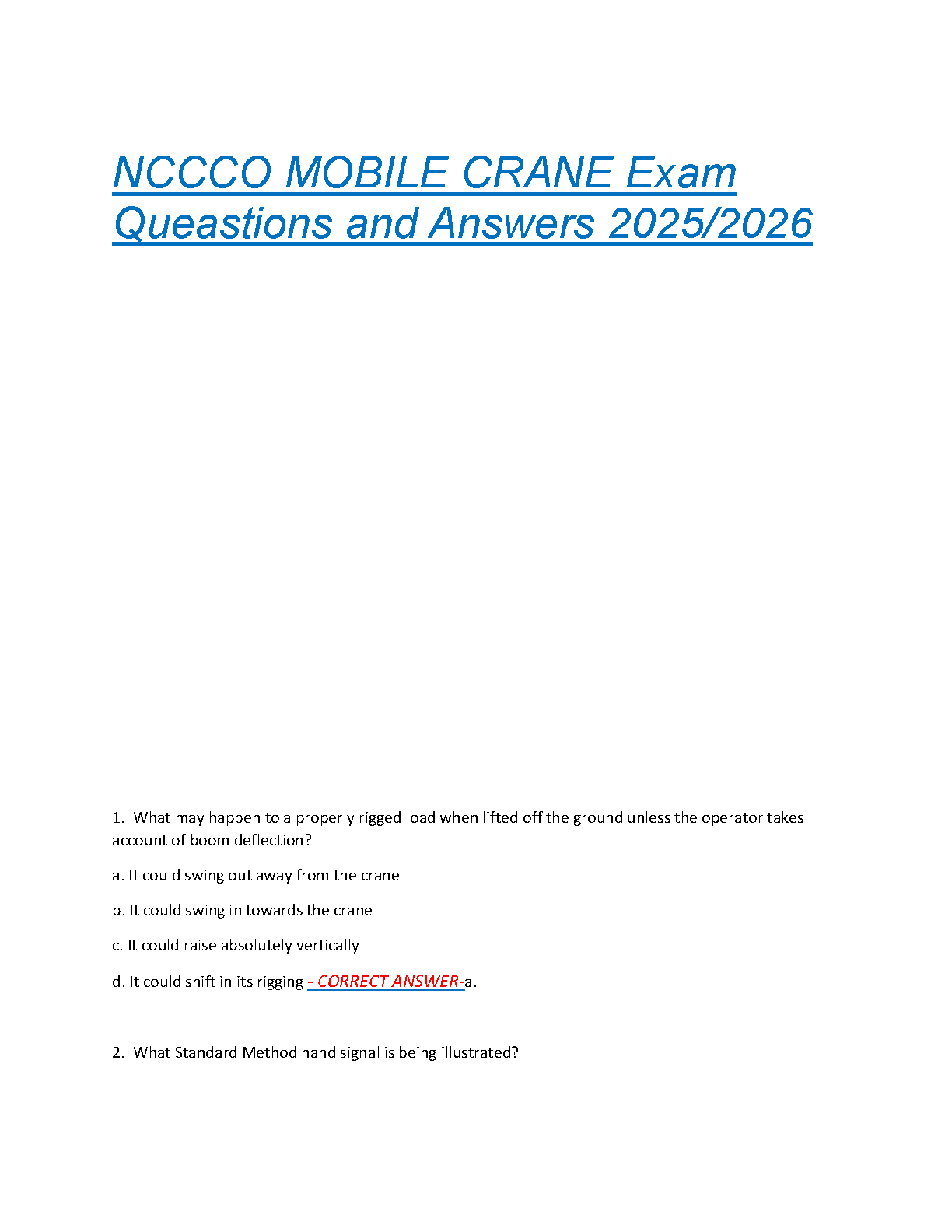 Unlock your career as a certified crane operator with our latest 2025/2026 NCCCO Mobile Crane Exam Test Bank. This essential study guide is packed with hundreds of practice questions and detailed, verified answers covering all critical topics, from load dynamics and boom deflection to standard hand signals and safety protocols. Designed to mirror the actual exam format, this resource is your ultimate tool to build confidence, master the material, and pass your NCCCO certification test on the very first attempt. Stop worrying about resits and start preparing for success today!