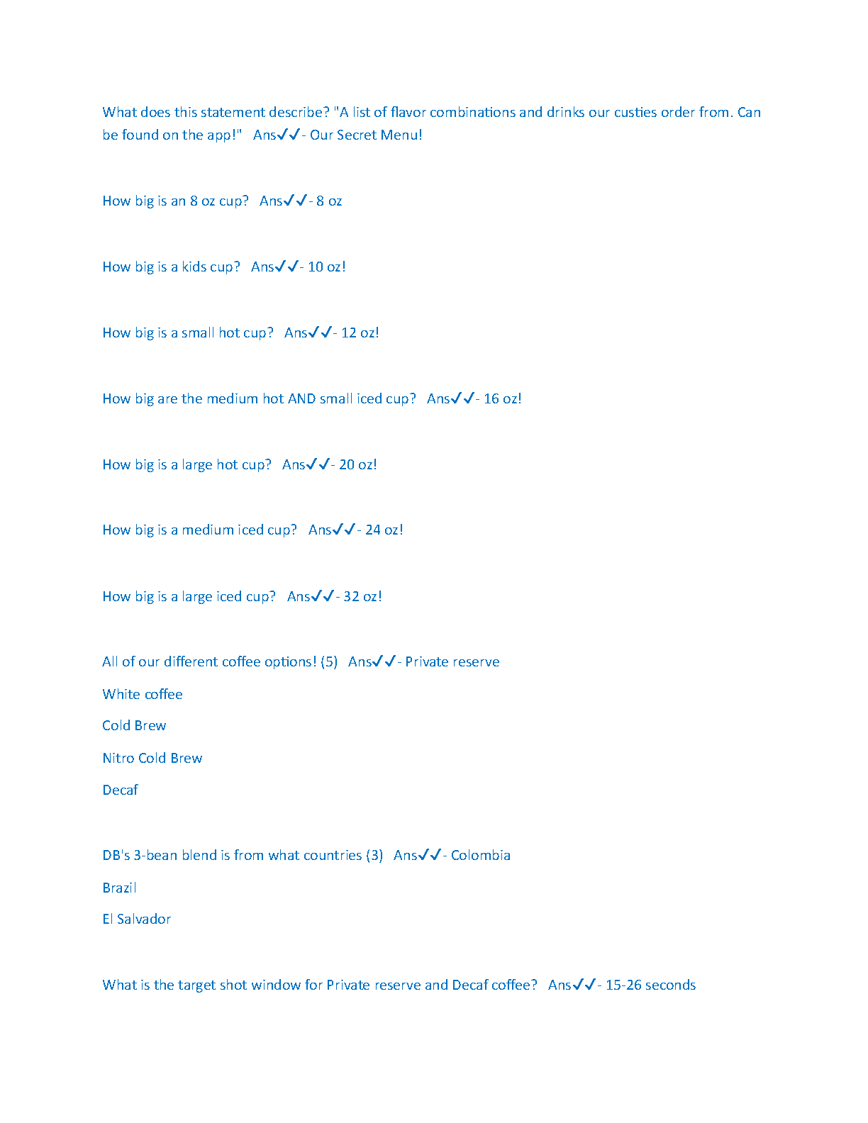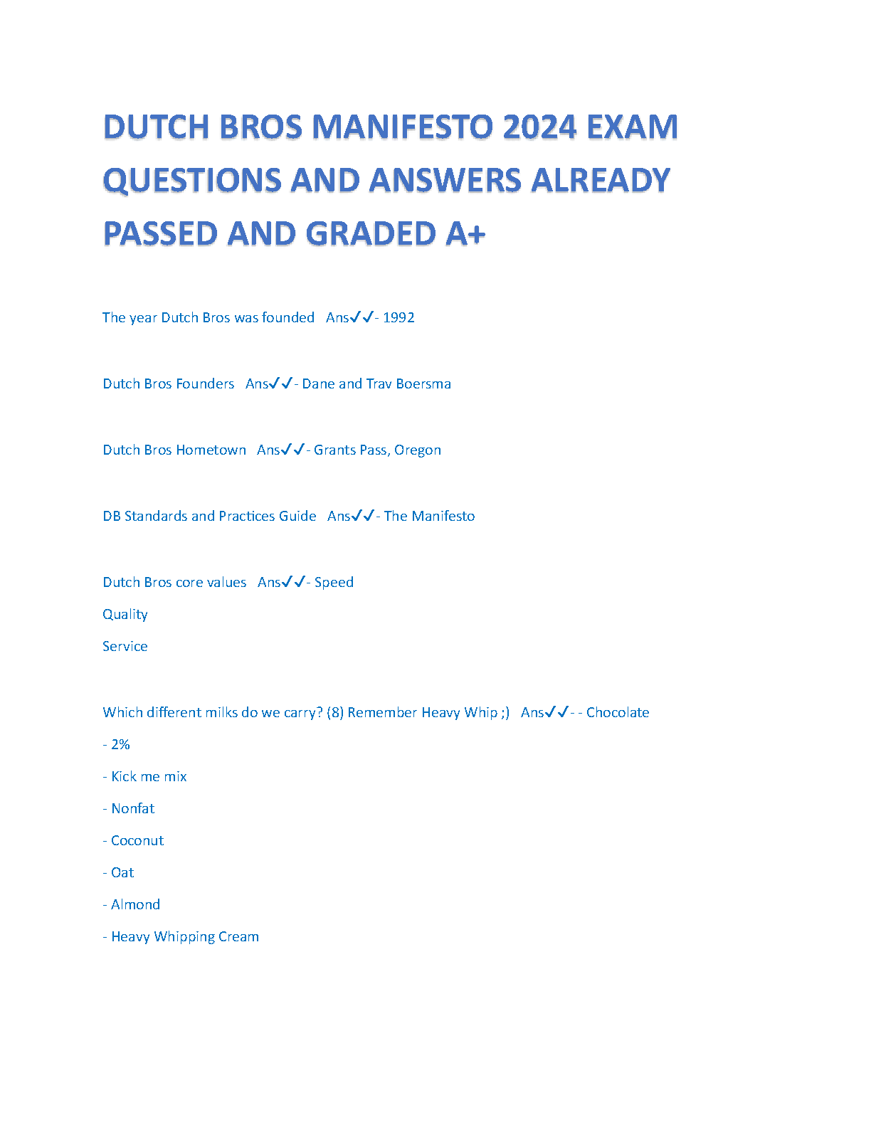 Ace your Dutch Bros Manifesto 2024 exam with this ultimate study guide! This comprehensive test bank features a complete collection of exam questions paired with verified, correct answers. Our resource covers all essential topics, including company history, the founders, core values (Speed, Quality, and Service), the DB Manifesto standards, and product details. This A+ graded material is your key to mastering the content and passing your Dutch Bros employee exam with confidence on your first try.