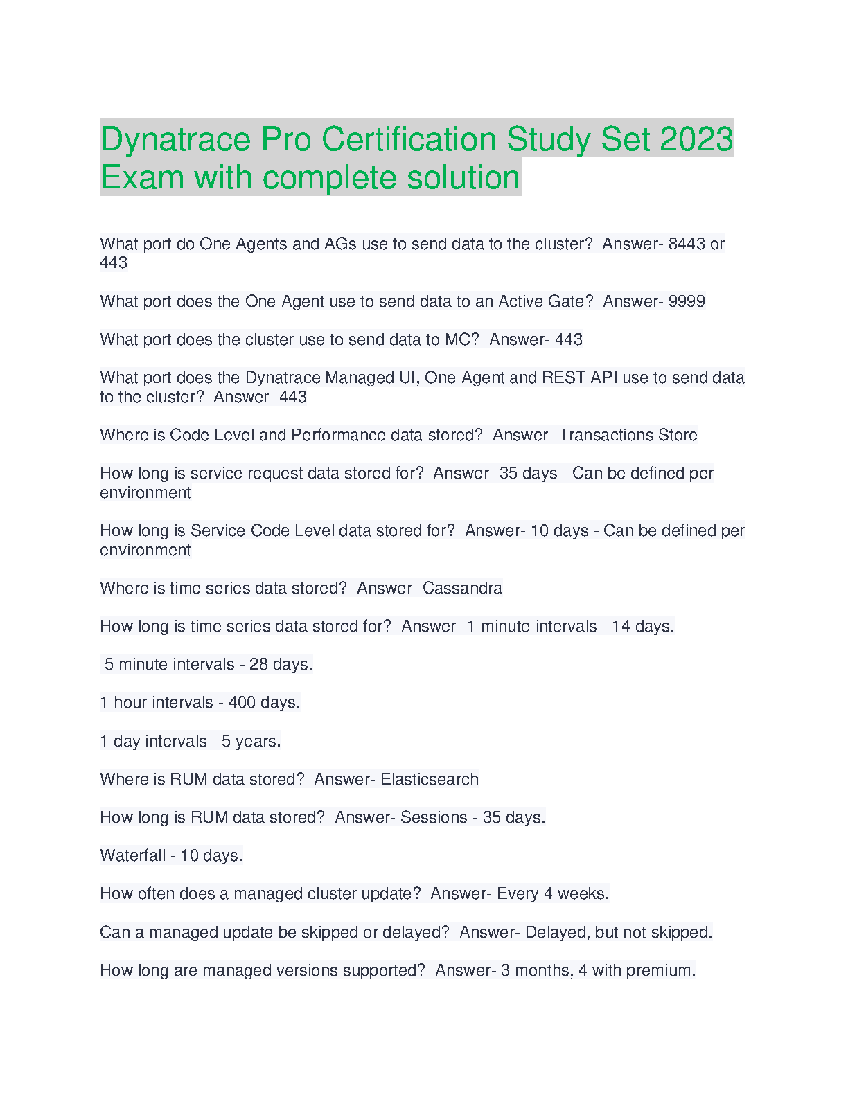 Ace your Dynatrace Professional Certification with our meticulously prepared 2023 Exam Test Bank. This comprehensive resource features a complete set of verified questions and detailed answers, covering all critical topics you'll face on the real exam. Master concepts like port configurations, data storage solutions (Cassandra, Elasticsearch), data retention periods, and cluster management. Our study set is designed to provide you with the knowledge and confidence to pass your certification on the first try. Get instant access to the complete solution and start your path to becoming a Dynatrace Pro today!