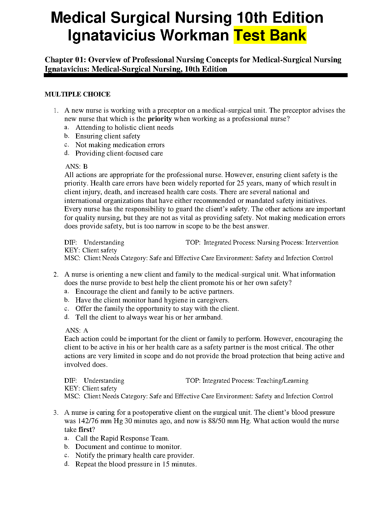 Test Bank for Medical-Surgical Nursing: Concepts for Interprofessional Collaborative Care, 10th Edition by Donna D. Ignatavicius, M. Linda Workman, Cherie R. Rebar, and Nicole M. Heimgartner