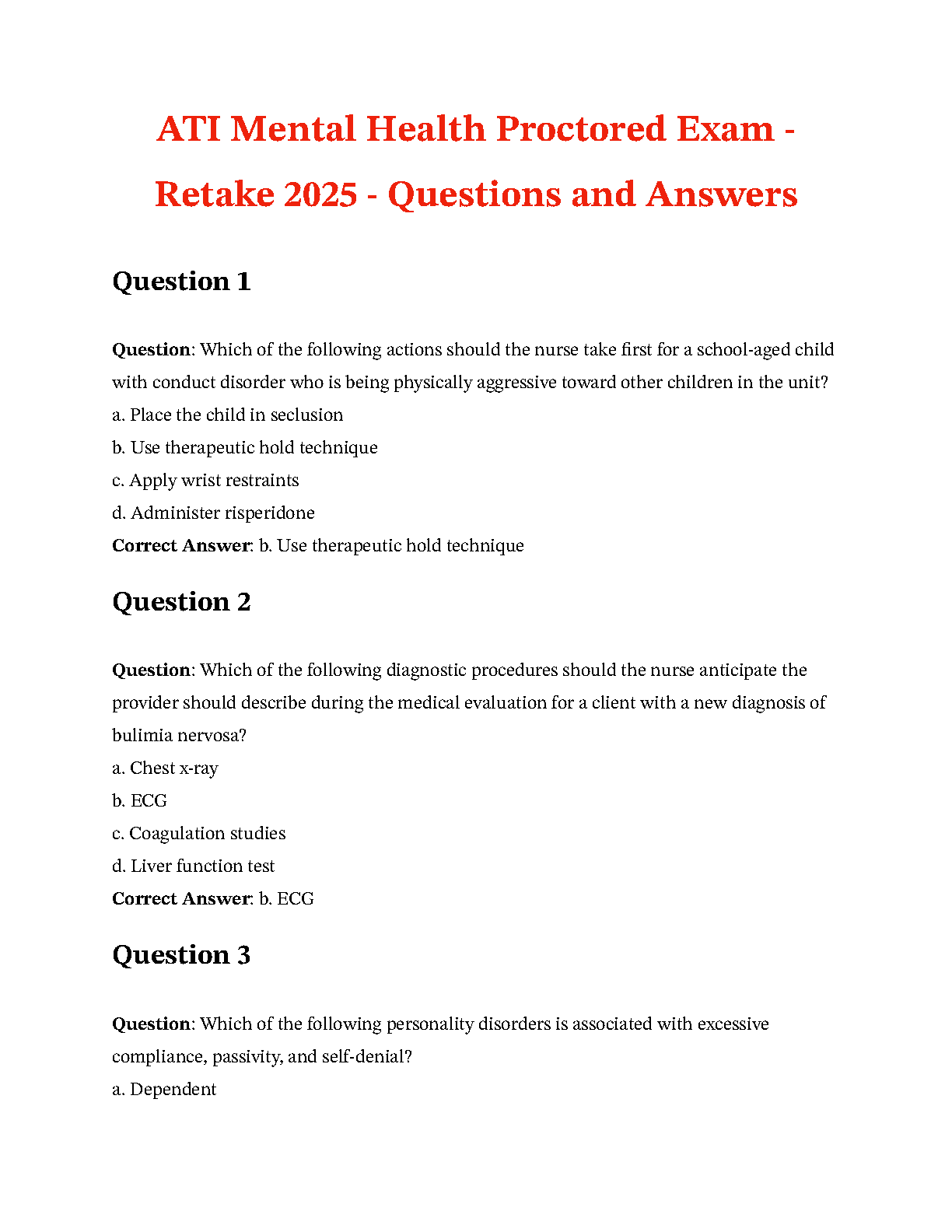 Unlock your potential and conquer the ATI Mental Health Proctored Exam with our latest 2025 Retake study guide. This comprehensive resource is packed with a curated collection of exam questions and their verified correct answers, mirroring the format and difficulty of the actual proctored exam. Designed for the 2025/2026 academic year, this guide helps you focus your studies, build confidence, and master the material needed to pass on your first attempt. Stop worrying about resits and start preparing for success today!